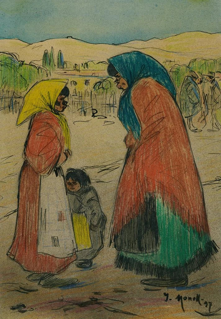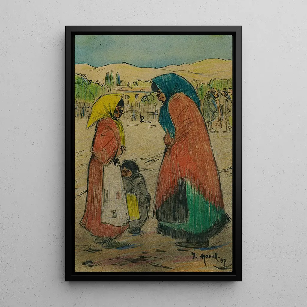 In the artwork "Gitans," Isidro Nonell captures the vibrant essence of Gypsy culture through a palette of warm, earthy colors. The characters, with marked and expressive features, seem to emerge from the canvas, evoking an atmosphere of mystery and passion. Nonell's technique, blending realism with a touch of impressionism, brings every detail to life, from the colorful drapery of the clothing to the deep gazes of the protagonists. This art print of the painting "Gitans" invites contemplation of human emotions and life stories, while immersing the viewer in the fascinating universe of the traveling people.