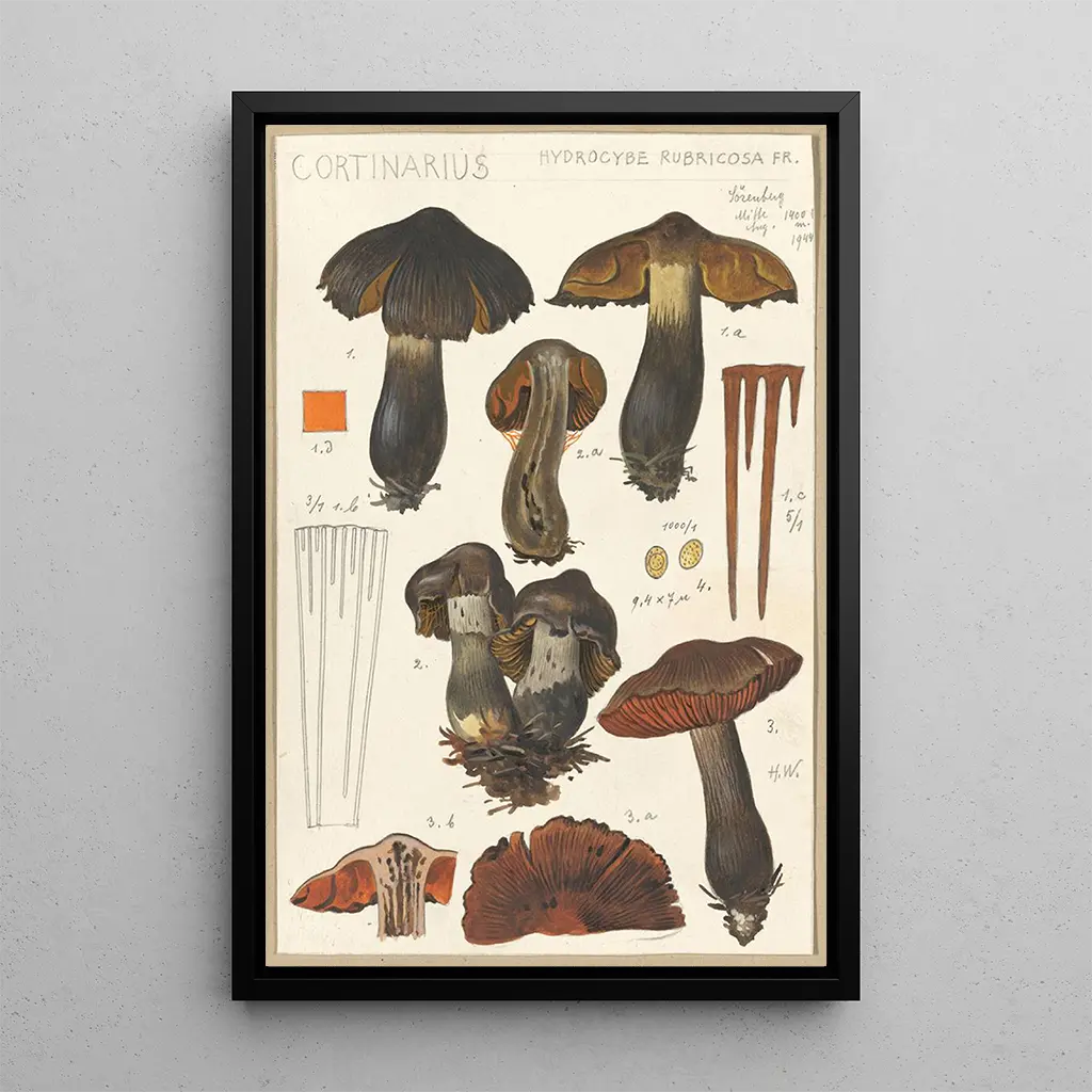 The art print of the work "Cortinaire" by Hans Baldung immerses us in a fascinating universe where nature and imagination meet. The vibrant colors, ranging from deep greens to earthy browns, create an atmosphere that is both mystical and organic. Baldung's technique, characterized by bold brushstrokes and meticulous attention to detail, brings this mushroom to life in a play of shadow and light. Each element of the canvas seems to breathe, inviting the viewer to explore the subtleties of the composition and to question the hidden message behind this representation.
