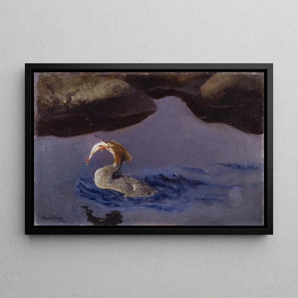 The art print Harle Female by Bruno Liljefors brilliantly captures the grace and beauty of this aquatic bird. The vibrant and varied colors of its plumage, ranging from shades of brown to flashes of orange and green, blend harmoniously with a serene natural background. The oil painting technique used by the artist gives a rich and lively texture to the work, creating a peaceful and contemplative atmosphere. Every detail, from the duck's reflection on the water to the delicacy of the surrounding grasses, invites the viewer to immerse themselves in a moment of tranquility.