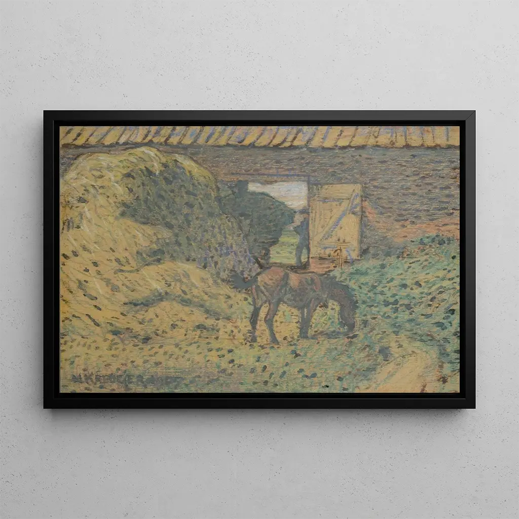The art print At the hayloft transports us to a rural landscape, where the golden sunlight filters through wooden beams. This canvas evokes the simplicity of country life, with characters engaged in everyday activities. The warm, earthy colors, combined with touches of green, create a calming and comforting atmosphere. The artist succeeds in capturing the essence of a moment frozen in time, inviting the viewer to immerse themselves in this serene scene.