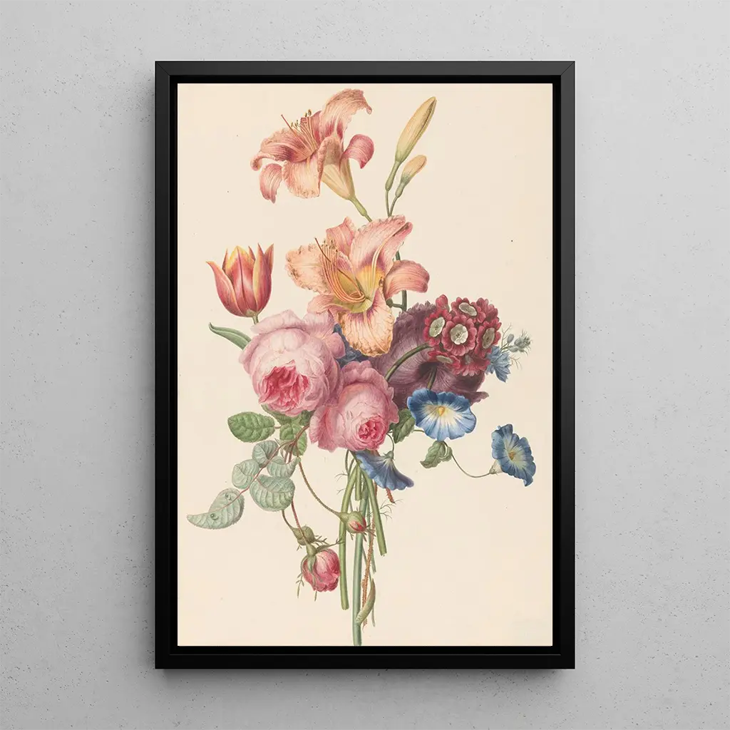 The art print Bouquet by Henriette Geertruida Knip is a true ode to nature. The flowers, vibrant and delicate, bloom across the canvas, creating a captivating visual harmony. The bright shades of red, yellow, and violet intertwine, while the lush greens add a touch of freshness. The artist's technique, blending realism and impressionism, allows viewers to almost feel the texture of the petals and the scent of the flowers. The atmosphere emanating from this piece is both joyful and soothing, inviting the viewer to immerse themselves in a lush garden where every detail matters.