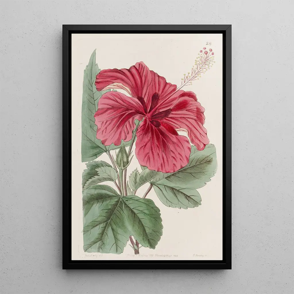 The art print Hibiscus cameronifulgens by Sydenham Edwards is a true ode to nature. With its vibrant petals and shades of red and yellow, this piece captures the very essence of the tropics. The use of gouache technique, applied with finesse, renders the delicate texture of the flowers while adding a fascinating depth to the overall composition. The atmosphere conveyed by this art print is both joyful and soothing, inviting the viewer to immerse themselves in a lush garden where every detail is celebrated.