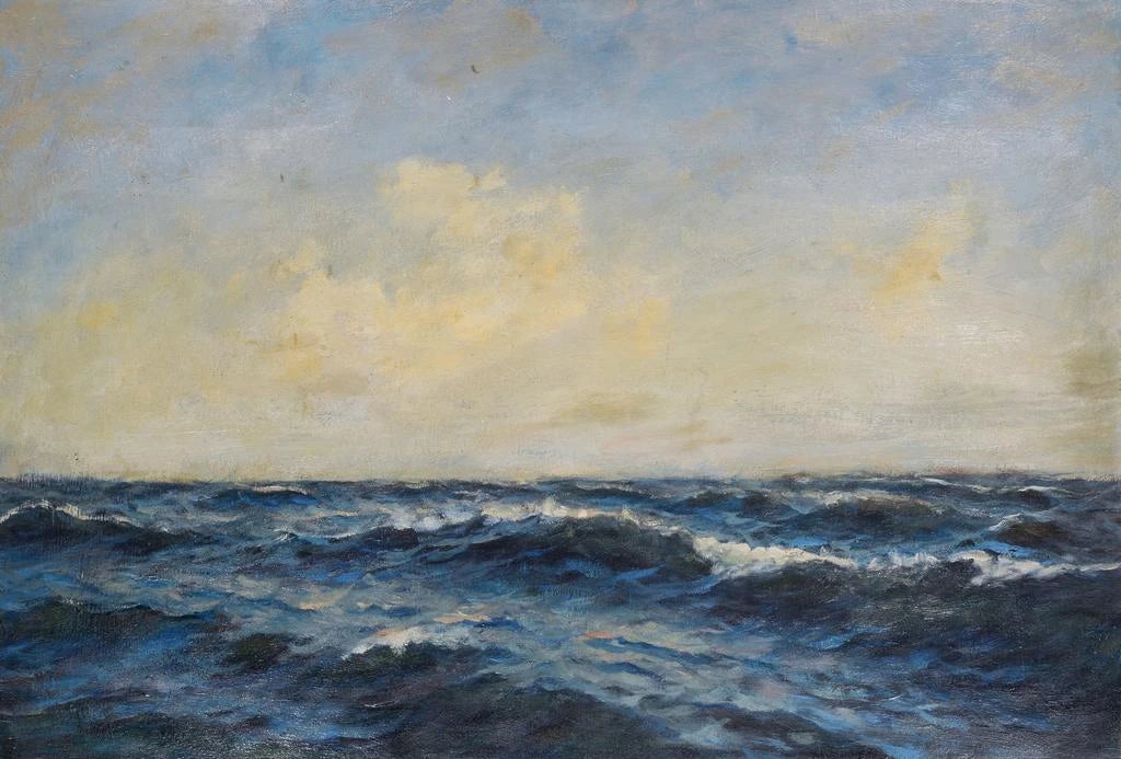 En haute mer de William de Goumois est une œuvre qui évoque la majesté des océans. Cette toile, avec ses nuances de bleu profond et ses éclats de lumière, capture la puissance et la beauté des vagues. Les mouvements fluides de l'eau, rendus avec une technique impressionniste, créent une atmosphère dynamique et vivante. Le ciel, tour à tour serein et tumultueux, reflète les émotions humaines face à la nature. Cette œuvre transporte le spectateur vers des horizons lointains, lui offrant une évasion poétique au cœur des éléments.