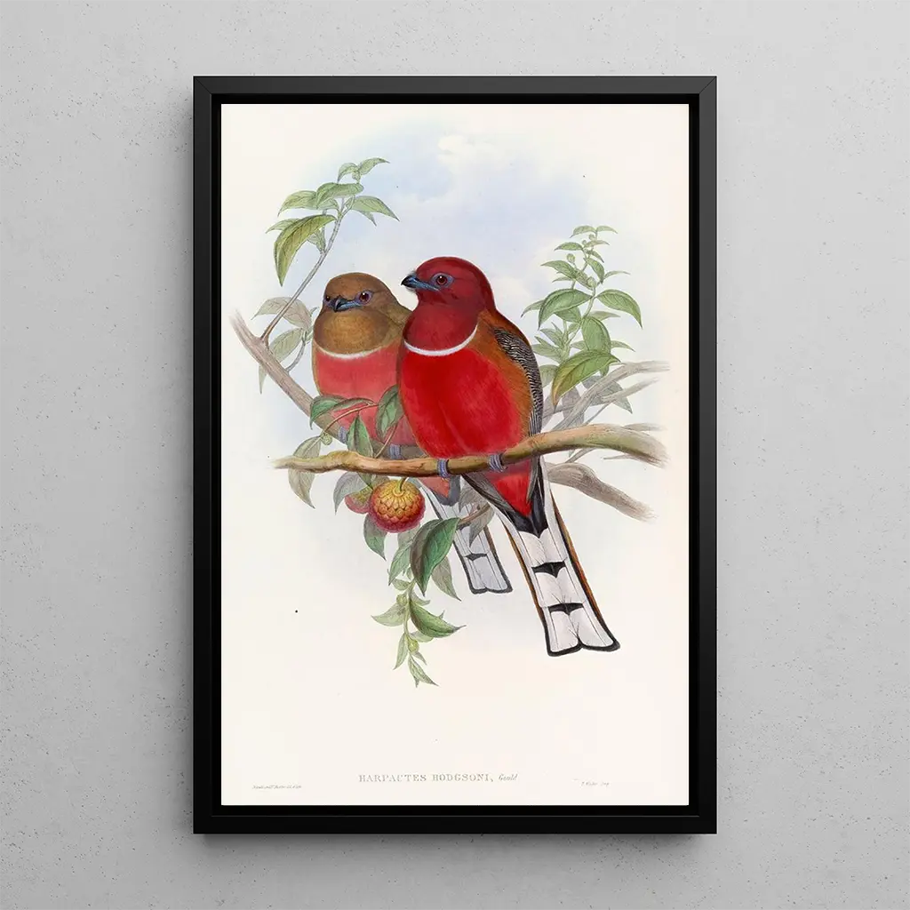 Trogon de Hodgson: a symphony of colors and shapes The art print of Trogon de Hodgson, created by John Gould, transports us to a world where nature unfolds with breathtaking beauty. This painting highlights a majestic bird, whose feathers in vivid shades of red, green, and yellow immediately draw the eye. The lithography technique used by Gould captures the subtleties of light and textures, creating a lively and dynamic atmosphere. The background, subtly worked, emphasizes the main subject, inviting the viewer to immerse themselves in this rich and colorful ecosystem. John Gould: art in the service of science John Gould, an emblematic figure of the 19th century, is renowned for his ornithological illustrations that combine scientific rigor with artistic sensibility. Traveling around the world, he collected bird specimens and was able to depict them with remarkable accuracy. His work, of which Trogon de Hodgson is part, reflects his commitment to the conservation and study of avian species. Gould also played a crucial role in popularizing ornithology, making the beauty and diversity of birds accessible to the general public. His legacy endures through his publications, which continue to inspire artists and naturalists. A decorative acquisition with multiple assets The art print of the Trogon de Hodgson is a decorative piece that will enhance your interior, whether in a living room, office, or bedroom. Its print quality ensures color fidelity and detail, allowing full appreciation of the splendor of the original artwork. With its aesthetic appeal, this canvas adds a touch of exoticism and sophistication to your decor. By choosing this art print, you are not only selecting a piece of art but also celebrating nature and the unmatched talent of John Gould.