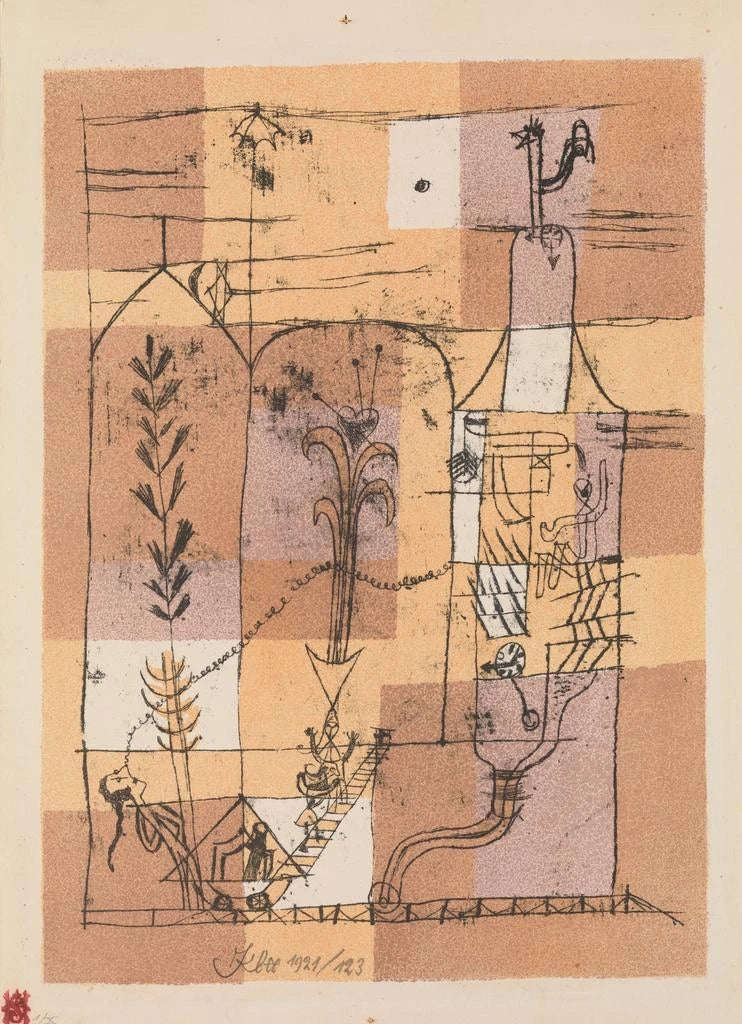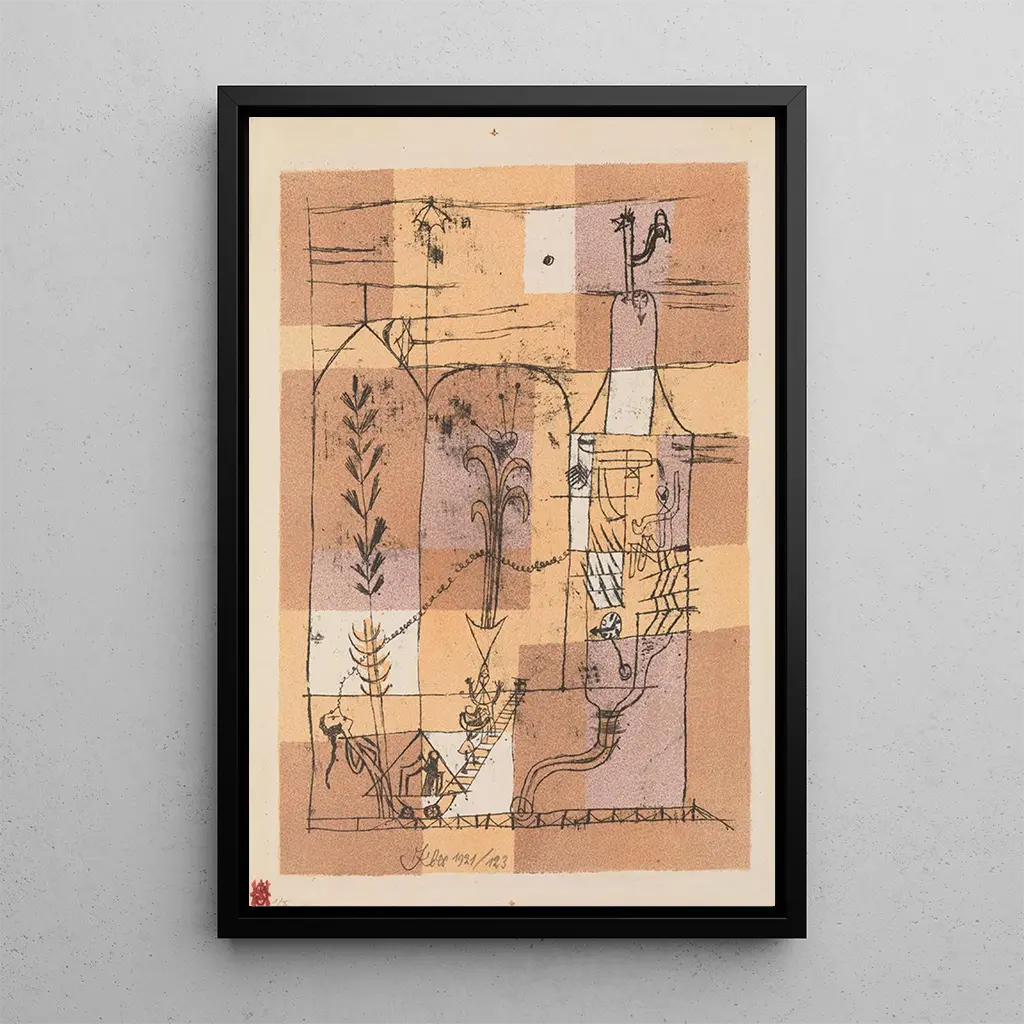 Paul Klee, an iconic figure of the early 20th century, mastered blending various artistic influences, ranging from cubism to expressionism. Born in Switzerland in 1879, he was an active member of the Bauhaus, a movement advocating the union of art and craft. His career is marked by a constant pursuit of harmony between form and color, and "Scene Hoffmannienne" is a perfect example. Klee often drew inspiration from music and poetry, which is reflected in his works, where each element seems to play a note in a visual symphony. His artistic legacy continues to influence many contemporary artists, demonstrating the importance of his work in art history.