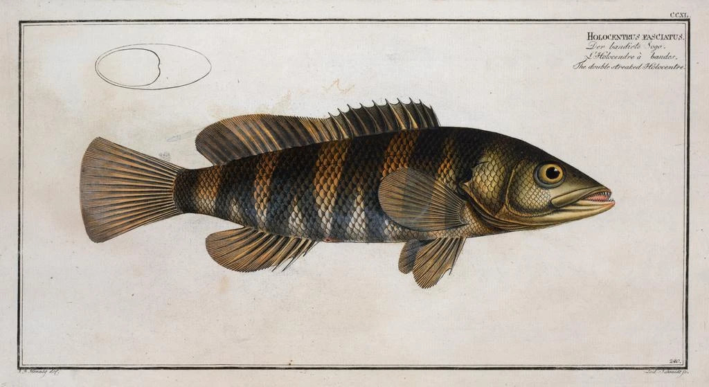 Marcus Elieser Bloch, a naturalist and artist of the 18th century, is renowned for his contributions to ichthyology, the science of fish. His works, including the art print Holocentrus fasciatus, are not only scientific illustrations but also remarkable pieces of art. Bloch traveled across Europe and studied various marine species, which allowed him to create accurate and artistic representations of aquatic fauna. His work has had a lasting impact on how fish are perceived in art and science, making him an essential figure in the history of naturalist art.