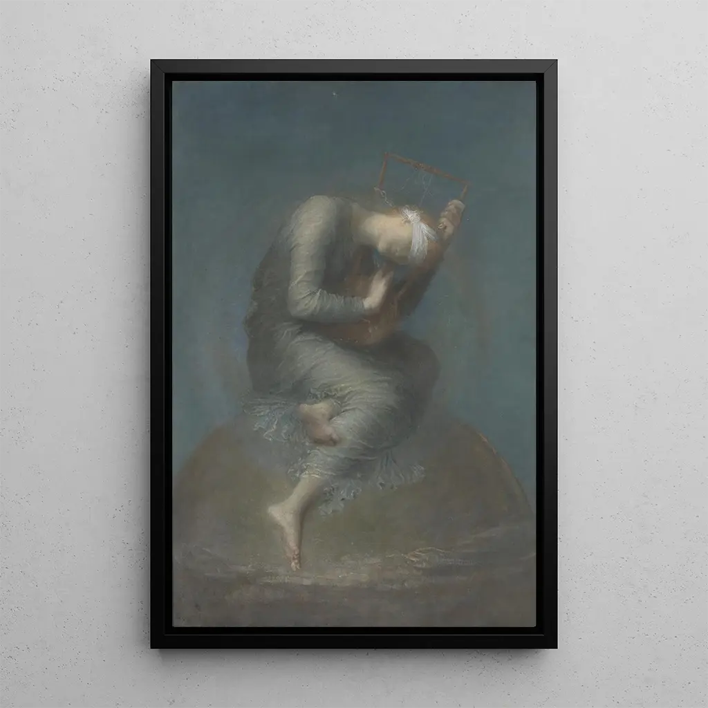In the art print "Hope," George Frederic Watts captures the very essence of human aspiration. This piece, imbued with symbolism, depicts a delicate female figure, eyes closed, holding a lyre, a symbol of music and harmony. The soft colors and pastel shades create a serene, almost ethereal atmosphere, while the dark background accentuates the luminosity of the protagonist. Watts's technique, blending oil painting with meticulous details, invites the viewer to introspective contemplation, revealing the struggles and hopes that reside within us all.