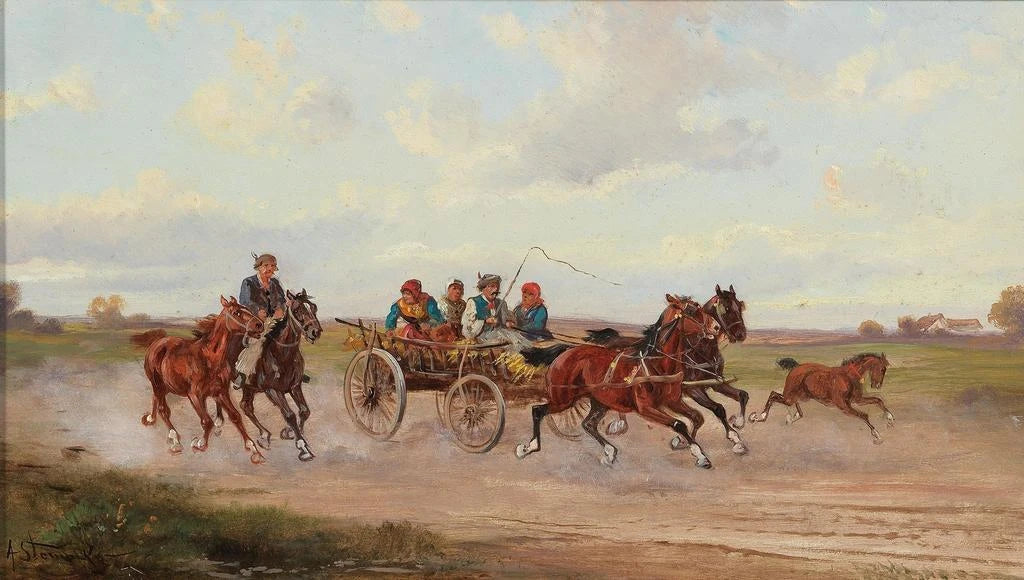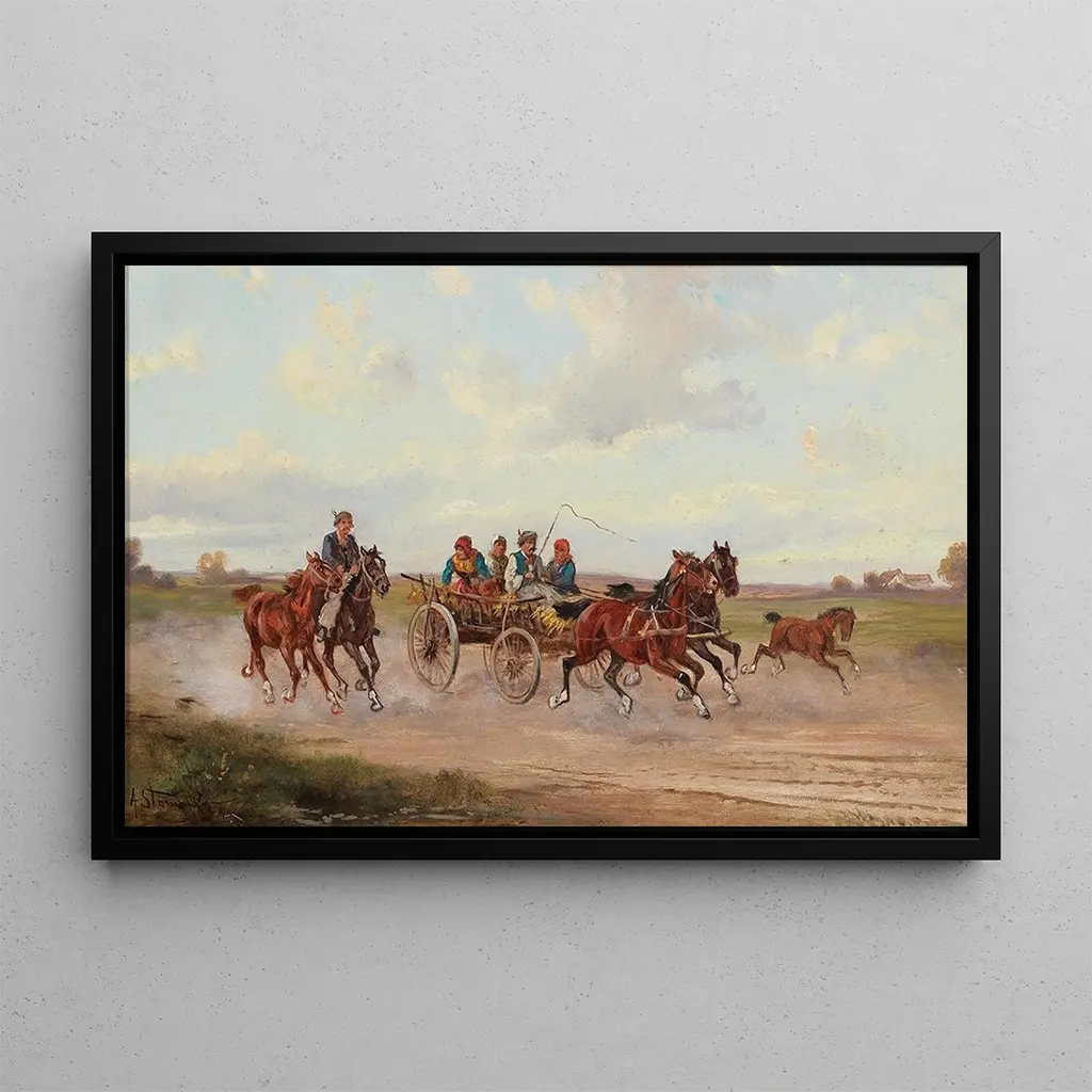 Hungarian Market Cart: A Vibrant and Colorful Scene The painting "Hungarian Market Cart" by Alfred Steinacker depicts a lively scene where rural life flourishes under a bright sky. The vivid colors, ranging from bright reds to lush greens, create a joyful and dynamic atmosphere. Steinacker's technique, characterized by expressive brushstrokes, brings the characters and objects to life, making the bustling market almost palpable. Every detail, from the cart loaded with fresh produce to the smiling faces of the vendors, invites the viewer to immerse themselves in this authentic representation of Hungarian culture. Alfred Steinacker: A Witness to Rural Life at the Turn of the 20th Century Born in 1858, Alfred Steinacker was a Hungarian painter who captured the essence of everyday life of his time. Influenced by the Impressionist movement, he developed a unique style that combines realism with touches of vibrant color. Active mainly at the end of the 19th century and the beginning of the 20th, he immortalized Hungary's traditions and landscapes through his works. His work is often regarded as a valuable testimony to the culture and lifestyles of his country, making him an important figure in Hungarian art. A Decorative Acquisition with Multiple Assets The art print of the "Hungarian Market Cart" is an ideal choice to enhance your interior, whether in a living room, office, or bedroom. Its printing quality guarantees fidelity to the colors and details of the original painting, adding an authentic touch to your decor. With its undeniable aesthetic appeal, this canvas draws the eye and sparks curiosity, while evoking a warm and welcoming atmosphere. Treat yourself to this piece to enrich your living space with a touch of history and culture.