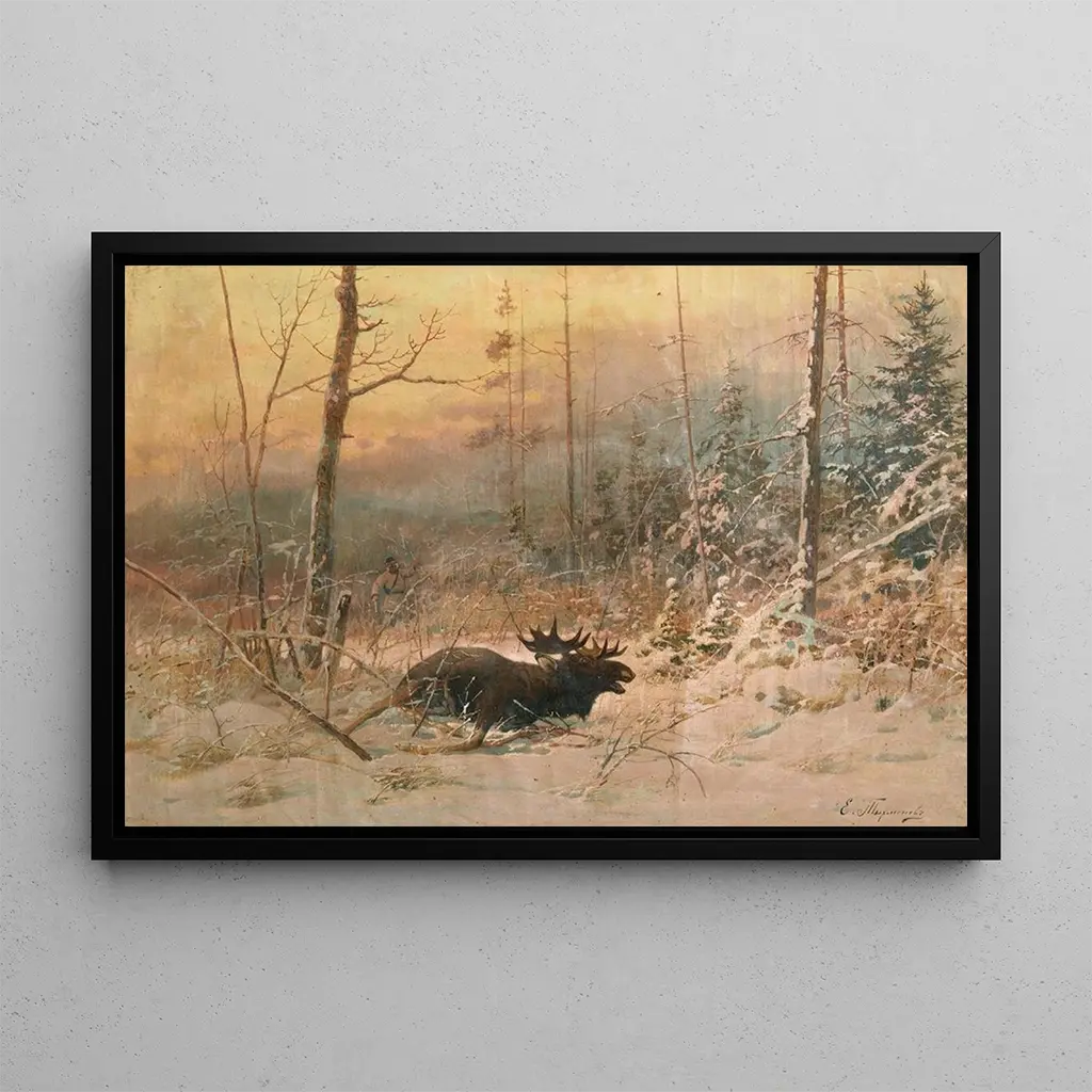 The art print Elk Hunt by Evgeni Alexandrovich Tikhmenev depicts a vibrant scene where the majesty of wildlife blends with the beauty of Nordic landscapes. The earthy colors and shades of green create a dynamic atmosphere, while the artist's technique, combining realism and impressionism, captures the energy of the moment. The elks, iconic figures of the wild, seem to gracefully charge forward, while the wooded background adds depth to this composition. This piece invites the viewer to immerse themselves in a world where harmony between man and nature is palpable.