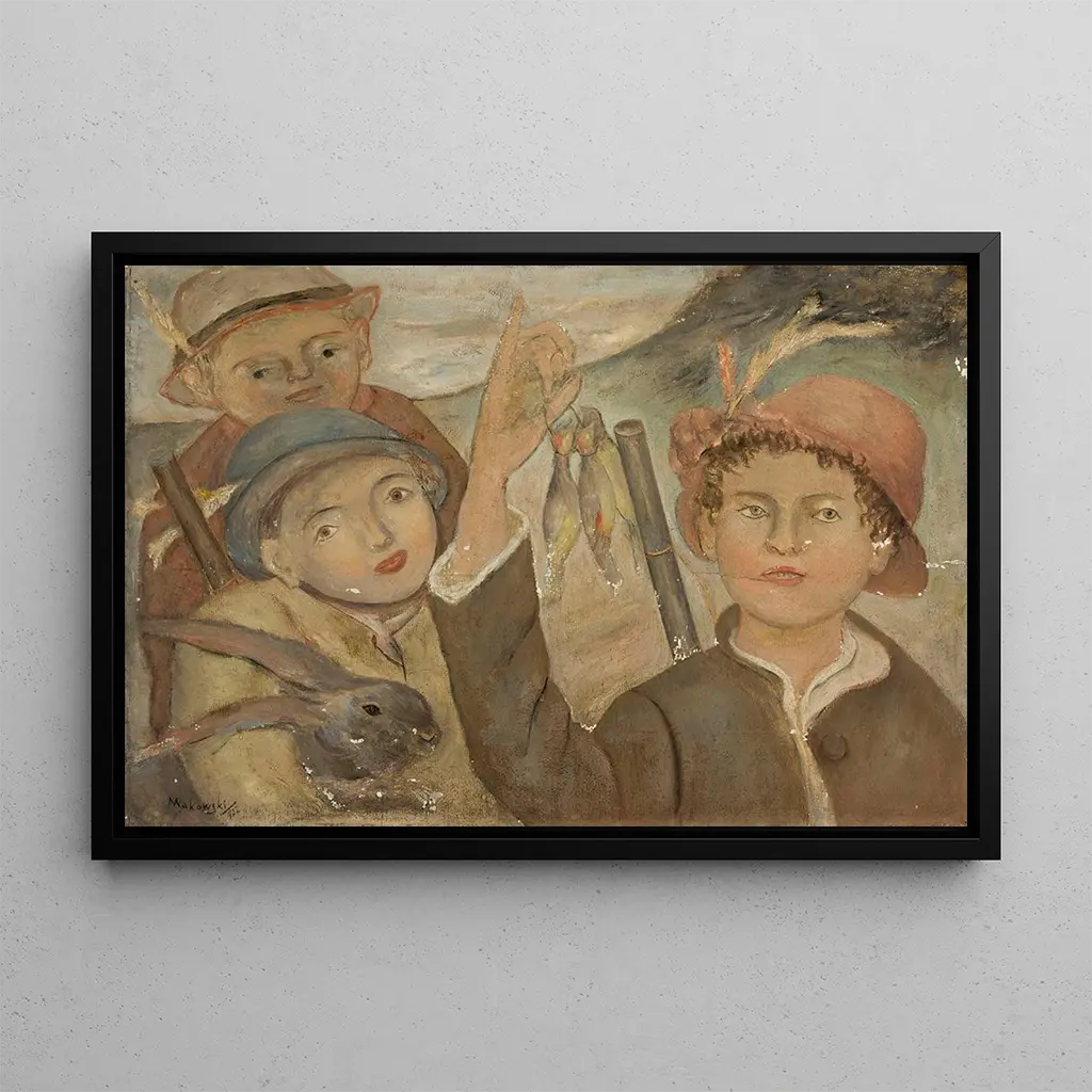 "Tadeusz Makowski's" art print of "Hunting scene" is a work that captures the essence of a traditional activity with a touch of dynamism. The earthy colors and meticulous details of the characters immerse the viewer in a vibrant scene where action is palpable. Makowski, with his distinctive style, uses stylized forms to represent hunters and their prey, creating a contrast between wild nature and man. The atmosphere of the canvas evokes both the tension of the hunt and the beauty of the surrounding landscapes, inviting reflection on the relationship between humans and nature.