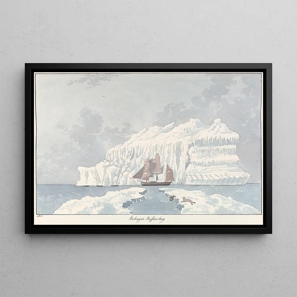 Iceberg in Baffin Bay, a captivating work by Charles Hamilton Smith, offers a striking view of Arctic landscapes. The canvas captures a vast iceberg majestically floating in crystal-clear waters, surrounded by snow-capped mountains. The shades of blue and white blend harmoniously, creating an atmosphere that is both calm and impressive. Smith, with his talent for depicting light, highlights the reflections and textures of the ice, making this scene almost tangible. The artwork invites contemplation of natural wonders and the challenges of life in these extreme regions.