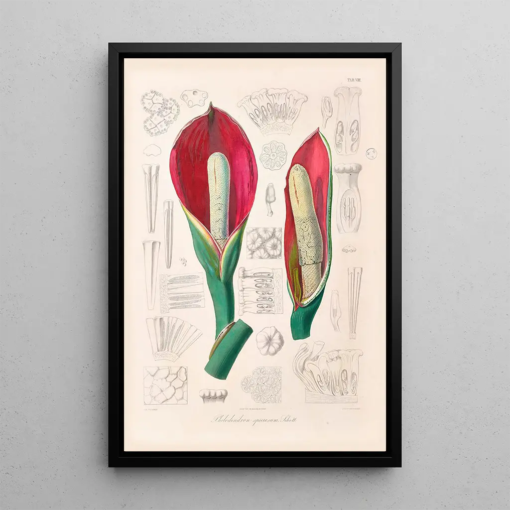 Icones Aroidearum Pl08: a celebration of botanical diversity The art print of Icones Aroidearum Pl08 immerses us in a universe rich in colors and shapes. This painting, created with a delicate engraving technique, highlights the beauty of aroid plants, with meticulous details that capture the essence of each species. The vibrant shades of green, yellow, and purple create a lively, almost magical atmosphere, inviting the viewer to explore the diversity of tropical flora. The harmonious composition and arrangement of plant elements reflect attentive observation of nature, offering a true ode to botany. Heinrich Wilhelm Schott: a pioneer of artistic botany Heinrich Wilhelm Schott, 19th-century botanist and illustrator, is recognized for his significant contributions to plant classification. His work sits at the crossroads of art and science, where he combined scientific precision with aesthetic appeal. Influenced by botanical explorations of his time, Schott dedicated his career to the study of aroids, a fascinating group of plants. His illustrations, such as those in Icones Aroidearum, are not only works of art but also valuable scientific documents that have helped deepen understanding of biodiversity. His legacy endures in the worlds of botany and art. A decorative acquisition with multiple assets The art print of Icones Aroidearum Pl08 is a decorative piece that fits well in a living room, office, or bedroom. Its aesthetic appeal and reproduction quality make it an ideal choice for those wishing to add a touch of nature to their interior. The fidelity of colors and details allows you to feel the beauty of aroids, while bringing a serene and calming ambiance. By choosing this canvas, you opt for a work that not only enhances your space but also evokes the richness of biodiversity.