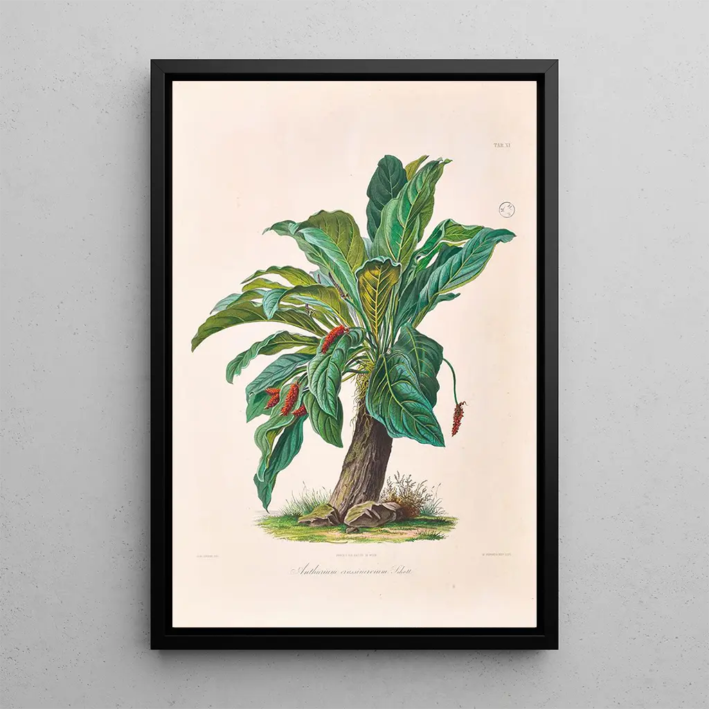 "Icones Aroidearum Pl11" by Heinrich Wilhelm Schott is a piece that transports the viewer into a lush world of exotic plants. This botanical art print stands out with its vibrant colors and meticulous details, revealing the complexity of the aroids. The composition is carefully balanced, with each plant occupying a precise place that highlights its uniqueness. The overall atmosphere of the work evokes a botanical exploration, where each element invites discovery and wonder at the beauty of nature.