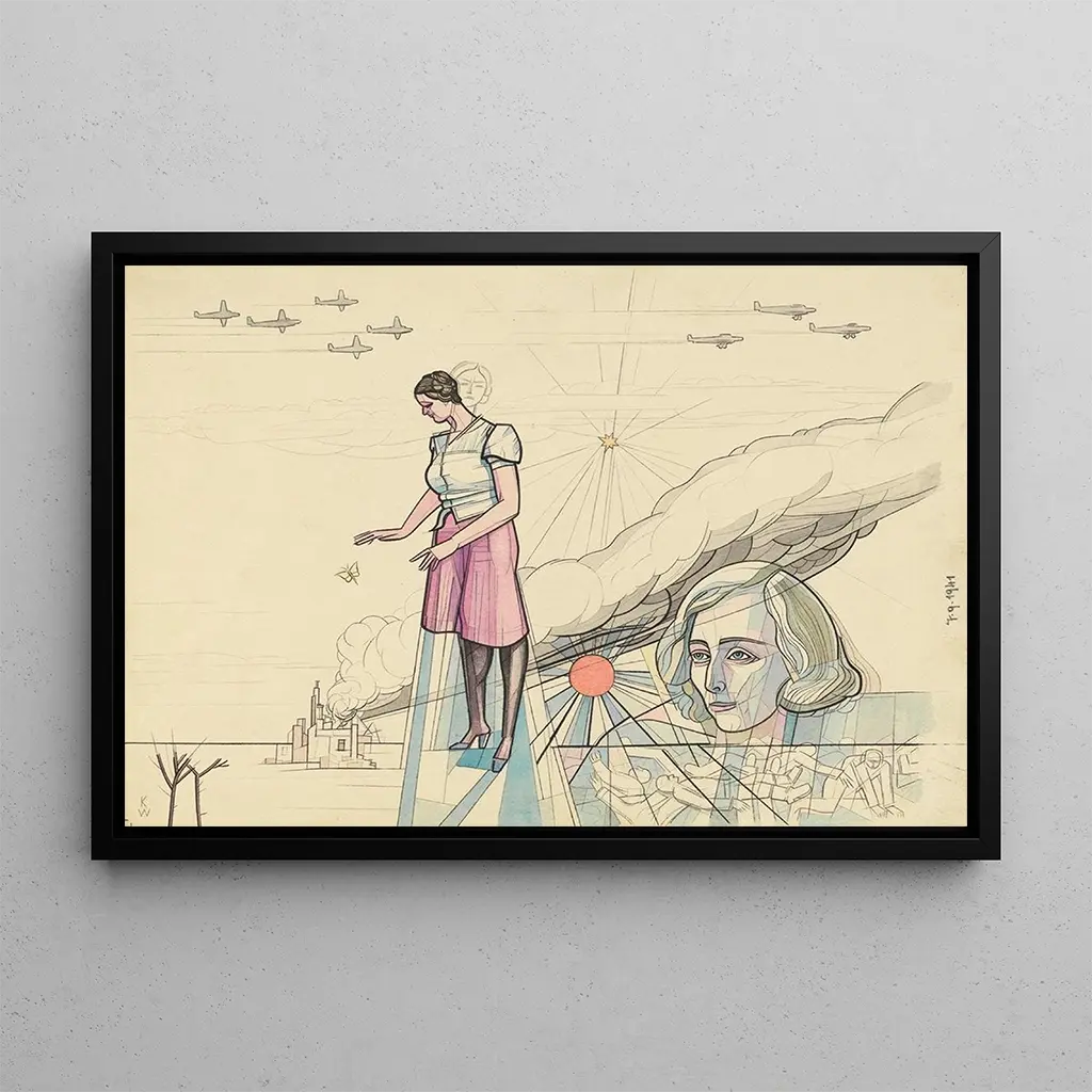 The art print of War Idyll immerses us in a universe where beauty and brutality coexist. This piece, filled with tension, juxtaposes elements of softness and conflict, creating a disturbing atmosphere. The dark colors and expressive strokes reveal the complex emotions of the characters, while the dynamic composition draws the eye and provokes thought. Every detail, from the faces to the backgrounds, is carefully crafted to convey a powerful message about the consequences of war. This canvas invites deep contemplation, questioning our relationship with violence and peace.