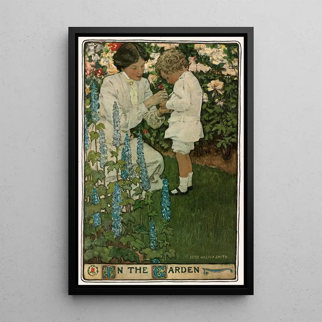 In the Garden, an iconic art print by Jessie Willcox Smith, unfolds a scene filled with serenity and tenderness. The composition highlights a young girl, surrounded by vibrant flowers and lush greenery, who appears to be immersed in a dreamlike world. The pastel colors, delicate and luminous, create a soothing atmosphere, where every detail is carefully rendered. The artist's technique, blending watercolor and drawing, gives this canvas an almost ethereal lightness, inviting the viewer to immerse themselves in this bubble of tranquility and childhood.