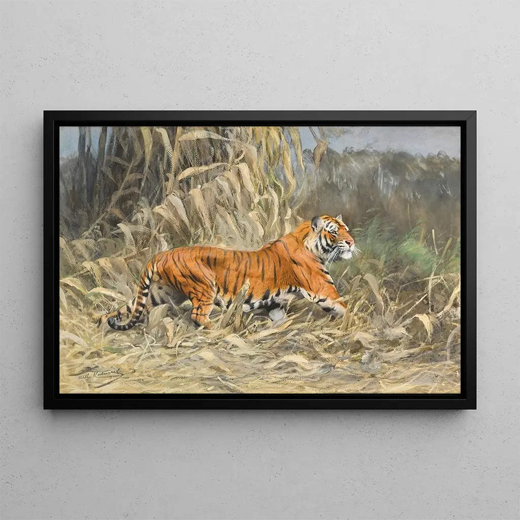 The art print In the Jungle by Wilhelm Kuhnert immerses us in a vibrant world of colors and life. This canvas, rich in detail, depicts a lively scene where fauna and flora intertwine in a fascinating harmony. The verdant shades of the foliage contrast with the flashes of light filtering through the branches, creating an atmosphere that is both serene and dynamic. The artist's technique, blending realism and impressionism, allows you to feel the warmth and humidity of this lush jungle, inviting the viewer to explore every corner of this lively scene.