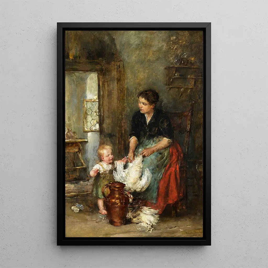 In the kitchen: an intimate and warm scene "Dans la cuisine" by Max Gaisser transports us to the heart of a home, where intimacy and conviviality blend seamlessly. This art print depicts a lively kitchen filled with characters engaged in everyday activities, from meal preparation to exchanges of smiles. The warm, earthy colors, typical of Gaisser's work, create a welcoming and comforting atmosphere. The artist's technique, combining realism with impressionist touches, allows you to feel the warmth of the scene, almost as if you could hear the laughter and conversations taking place. Max Gaisser: a daily life artist of the 20th century Max Gaisser, a German painter of the 20th century, is renowned for his ability to immortalize everyday life with a unique sensitivity. Influenced by the realist movement, he particularly focuses on scenes of domestic life, highlighting the beauty of simple moments. His work, often tinged with nostalgia, reflects an era when family life and human interactions were at the center of concerns. Gaisser captured the essence of these fleeting moments, making him a valuable artist for those who appreciate authenticity and depth in genre scenes. A decorative art print with multiple advantages The reproduction of "Dans la cuisine" is a perfect decorative choice to bring warmth and conviviality to your interior, whether in a kitchen, living room, or dining area. Its print quality and fidelity to the original artwork make it an attractive element for any decoration. This painting, with its warm colors and lively atmosphere, will delight your guests and enrich your living space. By choosing this canvas, you add a touch of authenticity and charm to your interior decor, while celebrating the beauty of shared moments.