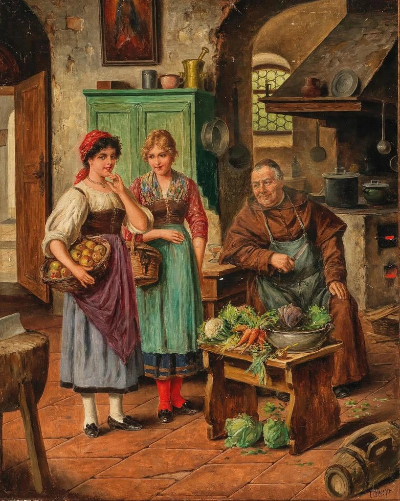 In a world where art dialogues with everyday life, the artwork "In the Monastery Kitchen" by Carl Ostersetzer stands as a vibrant testament to simplicity and authenticity. This painting, imbued with human warmth and serenity, immerses us in the heart of monastic life, a universe where daily routines blend with spirituality. Through this intimate scene, Ostersetzer invites us to discover a moment of reflection and sharing, where every detail seems to tell a story. The soft light bathing the room, the delicate gestures of the characters, and the everyday objects combine to create an almost tangible atmosphere, transporting us to a space-time that is both distant and familiar.