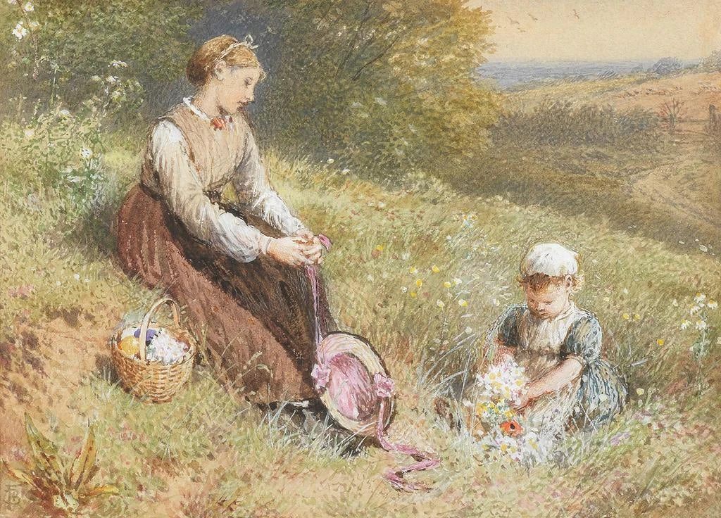 Myles Birket Foster, active in the 19th century, is known for his landscapes and scenes of rural life. Influenced by the Pre-Raphaelite movement, he strives to depict the beauty of nature with particular attention to detail. His career, marked by a constant exploration of light effects, allows him to create works imbued with poetry. "In the Meadow" is a perfect example of his style, where every element, from flowers to characters, is treated with care. Foster captured the very essence of rural life, making his works valuable testimonies of a bygone era.