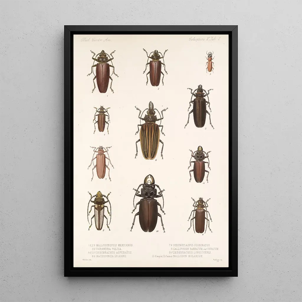 " Insecta Coleoptera Pl 207" by Frederick DuCane Godman is a captivating representation of the richness of beetles. This art print stands out for its meticulous details and vibrant colors, highlighting the beauty and diversity of these insects. The harmonious composition and the brilliance of the shades create a lively, almost enchanting atmosphere. Each element of this artwork invites exploration and discovery, revealing a fascinating and often little-known natural world.