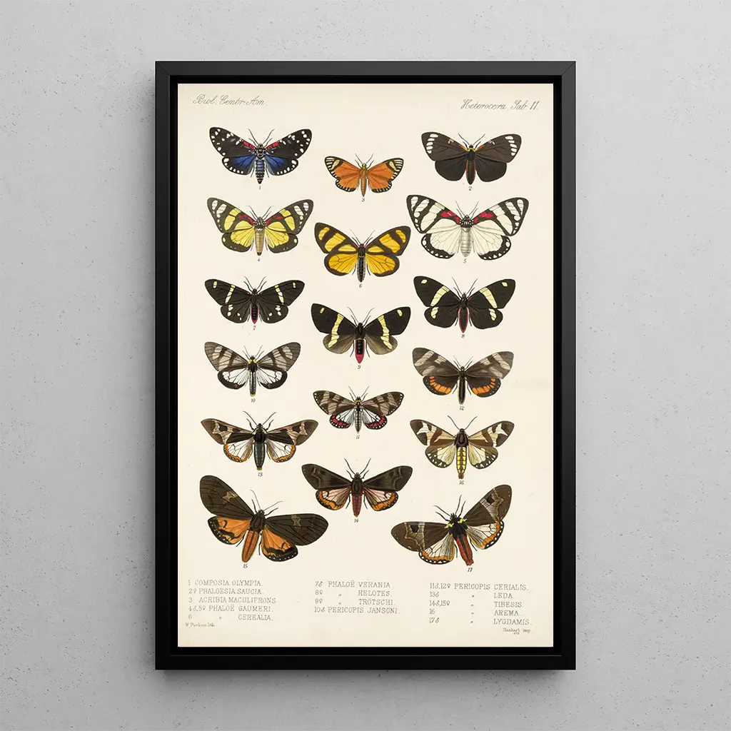 "Insecta Lepidoptera Heterocera Pl 011" by Frederick DuCane Godman is an art print that highlights the richness of nocturnal butterflies. With meticulous attention to detail, this illustration reveals patterns and colors that captivate the eye. The dark and luminous shades blend harmoniously, creating an atmosphere that is both mysterious and enchanting. Godman's technique, which combines watercolor and drawing, pays homage to these fascinating creatures while offering an artistic vision of their natural beauty.