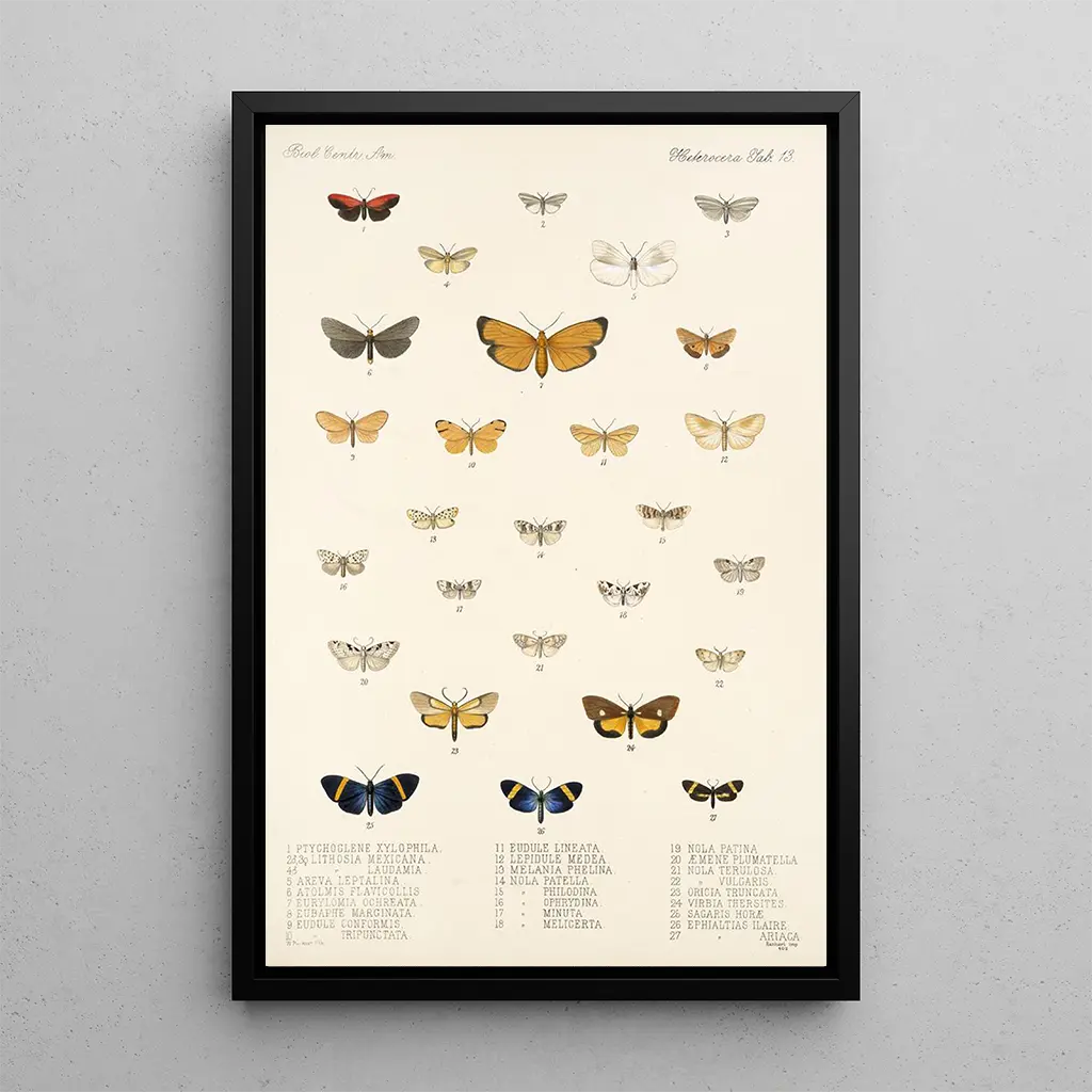 Insecta Lepidoptera Heterocera Art Print Pl 013: a tribute to entomological diversity The art print Insecta Lepidoptera Heterocera Art Print Pl 013 reveals a fascinating variety of butterflies, each bearing vibrant colors and unique patterns. This piece, created with remarkable precision, captures the very essence of biodiversity. The shades of blue, yellow, and red blend harmoniously, creating a lively tableau that draws the eye. The watercolor technique used by Godman gives each insect a lightness and delicacy, inviting viewers to marvel at the beauty of these fragile beings. Frederick DuCane Godman: an artist at the crossroads of art and science Frederick DuCane Godman, an emblematic figure of the 19th century, managed to combine his love for art and his passion for entomology. His works, such as Insecta Lepidoptera Heterocera, testify to his commitment to documenting the richness of the insect world. Influenced by the scientific advances of his time, Godman created illustrations that have become references in the field. His work has not only enriched the art world but also contributed to the understanding and appreciation of biodiversity. A decorative acquisition with multiple assets The reproduction of the painting Insecta Lepidoptera Heterocera Art Print Pl 013 is a valuable addition to any art collection. Whether you choose to display it in your living room, office, or bedroom, this canvas will add a touch of color and elegance to your decor. Its printing quality ensures remarkable fidelity to the details of the original artwork, while offering an aesthetic appeal that is sure to pique your guests’ curiosity. By integrating this piece into your space, you will celebrate the beauty of nature while enriching your interior.