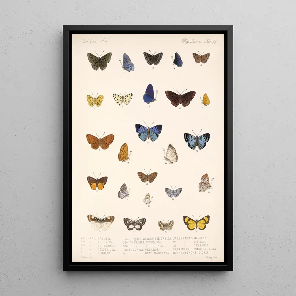 The art print Insecta Lepidoptera Rhopalocera Pl 045 offers a captivating immersion into the colorful universe of butterflies. With vibrant hues and meticulous details, this piece highlights the delicate beauty of these insects. The shades of blue, yellow, and black blend harmoniously, creating an atmosphere that is both lively and soothing. The naturalist illustration technique, characteristic of the period, captures the very essence of these ephemeral creatures, inviting viewers to contemplate the richness of biodiversity.
