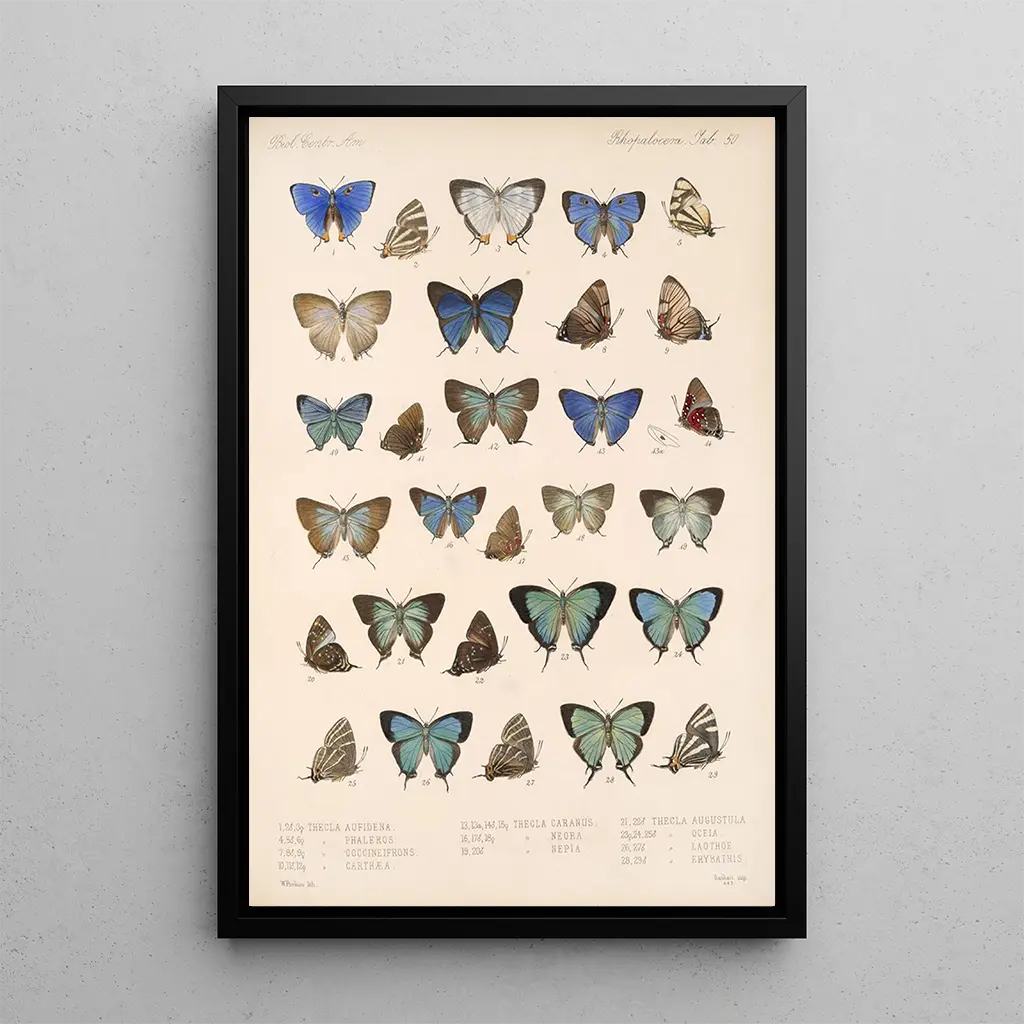 "Insecta Lepidoptera Rhopalocera Pl 051" by Frederick DuCane Godman is a captivating art print that celebrates the magnificence of butterflies. This reproduction features a variety of species, each adorned with dazzling patterns and colors. The delicate shades, ranging from soft pastels to vibrant hues, create an ambiance that is both serene and dynamic. The watercolor technique, mastered by Godman, captures the lightness of the wings and the complexity of the details, inviting the viewer to appreciate the fragile beauty of these creatures. Each butterfly seems to come to life, floating in a space where art and nature meet.
