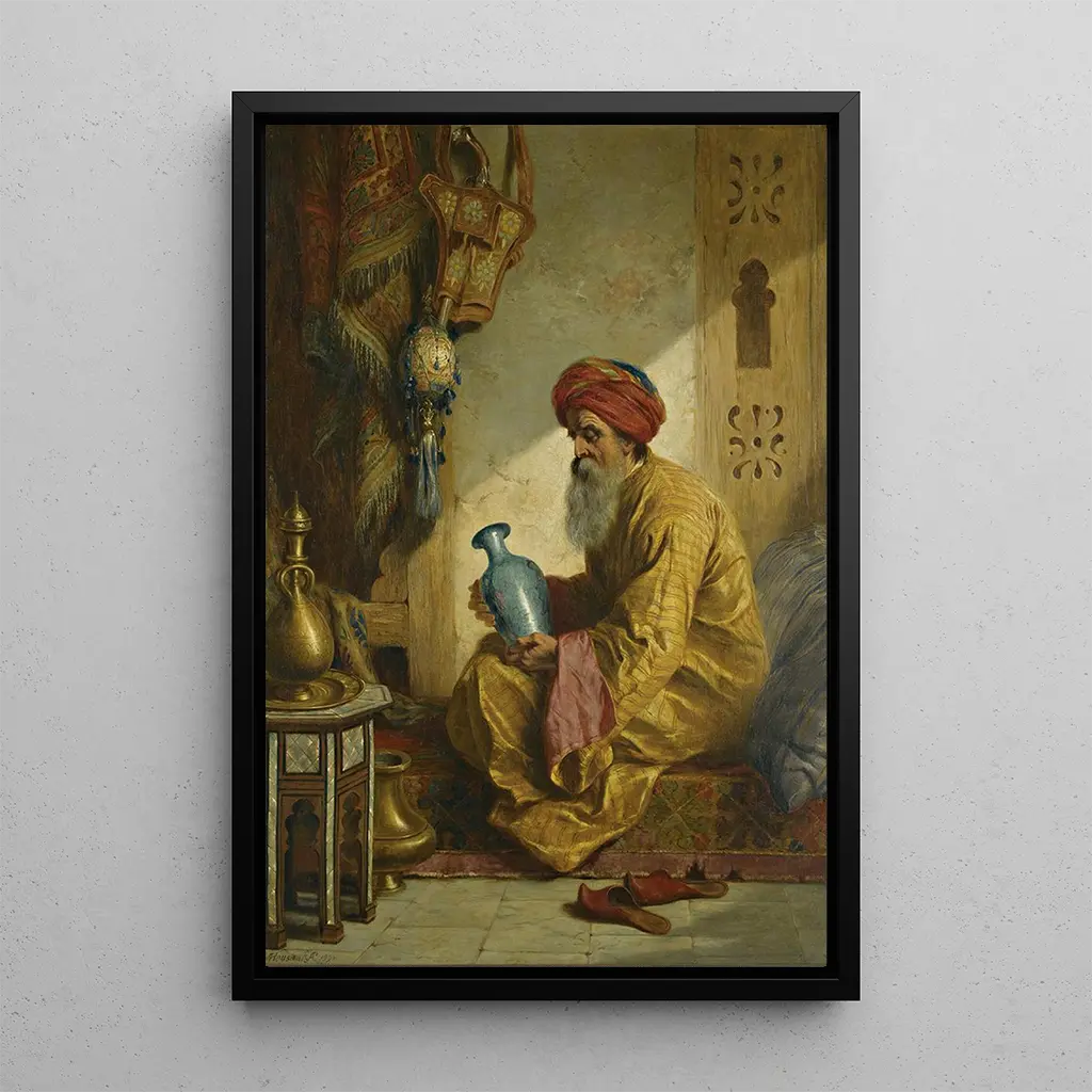 The art print "Inspection of the vase" by John Adam Houston immerses us in a delicate atmosphere where the object becomes the protagonist of an intimate scene. The composition is carefully orchestrated, highlighting a richly decorated vase, surrounded by subtle details that draw the eye. The colors, soft and harmonious, create a soothing ambiance, while the oil painting technique reveals an impressive mastery of reflections and textures. Houston manages to capture the light in a way that brings the object to life, inviting the viewer to pause and contemplate the beauty of simple things.
