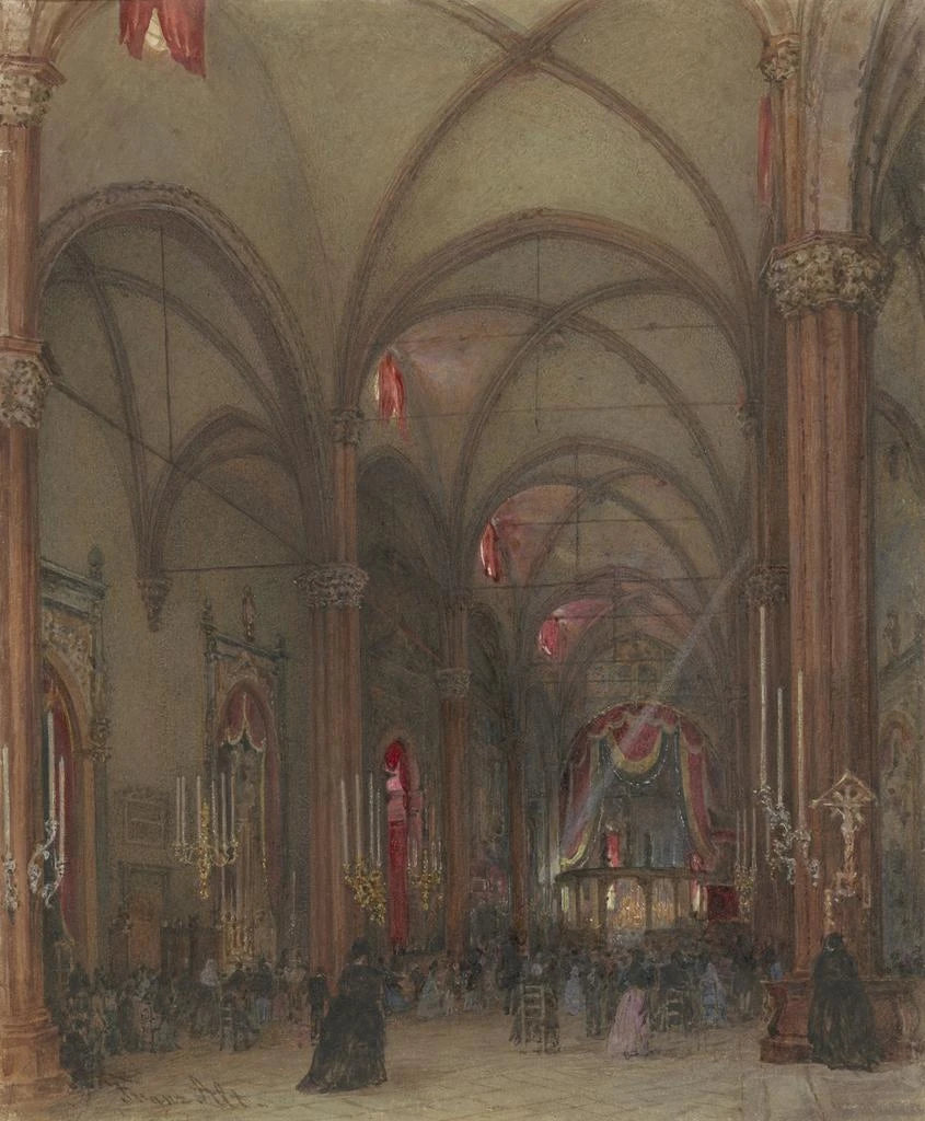 Franz Alt's style is characterized by a realistic approach, but also by an impressionist sensitivity that manifests in the way he renders light. In "Interior of the Verona Cathedral," he uses vibrant color strokes to create an almost tangible atmosphere. The architectural details, carefully observed, are highlighted by play of light that reveals the grandeur of the space. The majestic vaults and imposing columns seem to rise toward the sky, while the wooden benches and decorative elements add a human dimension to this space. This work stands out for its harmony, where each element is in symbiosis with the whole, creating a sense of balance and peace. Alt thus succeeds in capturing not only the appearance of the cathedral but also its spiritual essence, making his painting a true ode to sacred beauty.