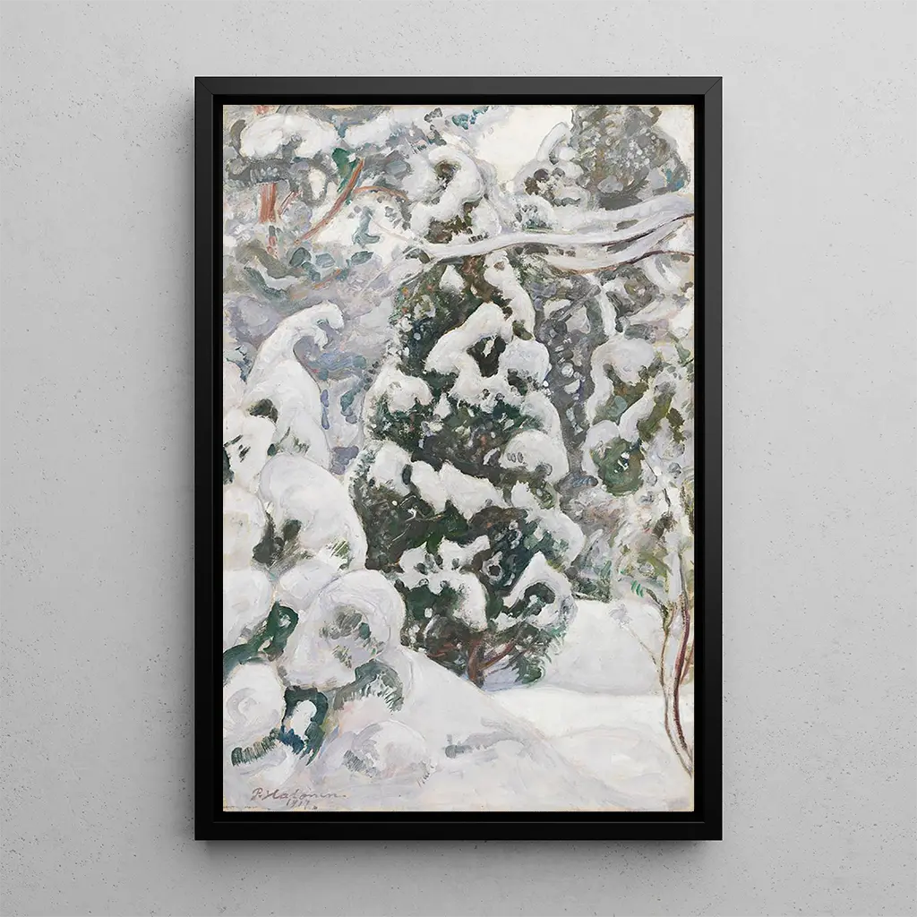 Dans cette reproduction de l'œuvre "Genévrier dans la neige", Pekka Halonen nous plonge dans un paysage hivernal où la neige recouvre délicatement le sol et les branches des arbres. Les nuances de blanc et de bleu créent une atmosphère paisible, presque magique, tandis que le genévrier, majestueux et résistant, se dresse fièrement au milieu de cette blancheur éclatante. La technique de Halonen, qui mêle réalisme et impressionnisme, permet de ressentir la fraîcheur de l'air et le silence apaisant de la nature en hiver. Chaque coup de pinceau semble capturer la lumière d'une journée d'hiver, offrant une invitation à la contemplation.