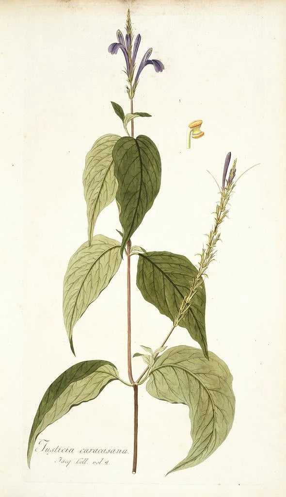 Nikolaus Joseph Freiherr von Jacquin, botanist and artist of the 18th century, left his mark with precise and poetic botanical illustrations. His travels in South America enabled him to discover a multitude of plants, including Justicia caracasana. Influenced by the scientific currents of his time, Jacquin knew how to combine art and science, contributing to the advancement of botanical knowledge. His work is a testament to the wonder inspired by nature and the importance of its preservation, making him an emblematic figure of botanical illustration.