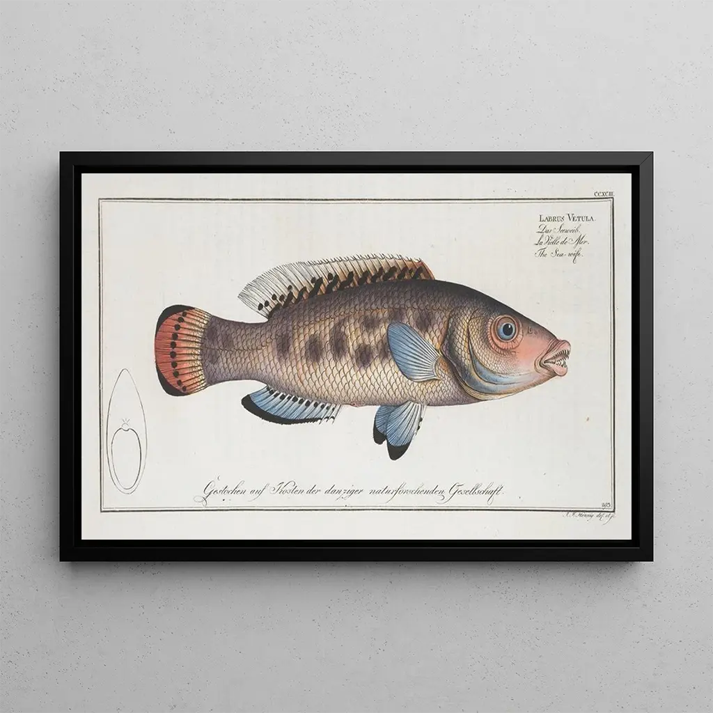 The art print "Labrus Vetula, the Seawife" by Marcus Elieser Bloch offers a fascinating depiction of marine life, highlighting the beauty and diversity of aquatic species. The vivid and detailed colors of this fish, with its shades of green and blue, catch the eye and evoke the depths of the ocean. Bloch's precise technique, blending realism and aesthetics, pays tribute to the richness of underwater fauna. This artwork is a true invitation to explore the mysteries of the ocean and to appreciate the delicacy of its inhabitants.