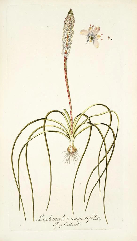 Nikolaus Joseph Freiherr von Jacquin, an 18th-century botanist and artist, left his mark through his contributions to botany and art. His travels around the world enabled him to discover and document numerous plant species, including Lachenalia angustifolia. His artistic style, characterized by scientific precision and aesthetic sensitivity, reflects the Enlightenment spirit, where curiosity and exploration were celebrated. Jacquin thus left a legacy that combines beauty and knowledge, influencing future generations of artists and scientists.