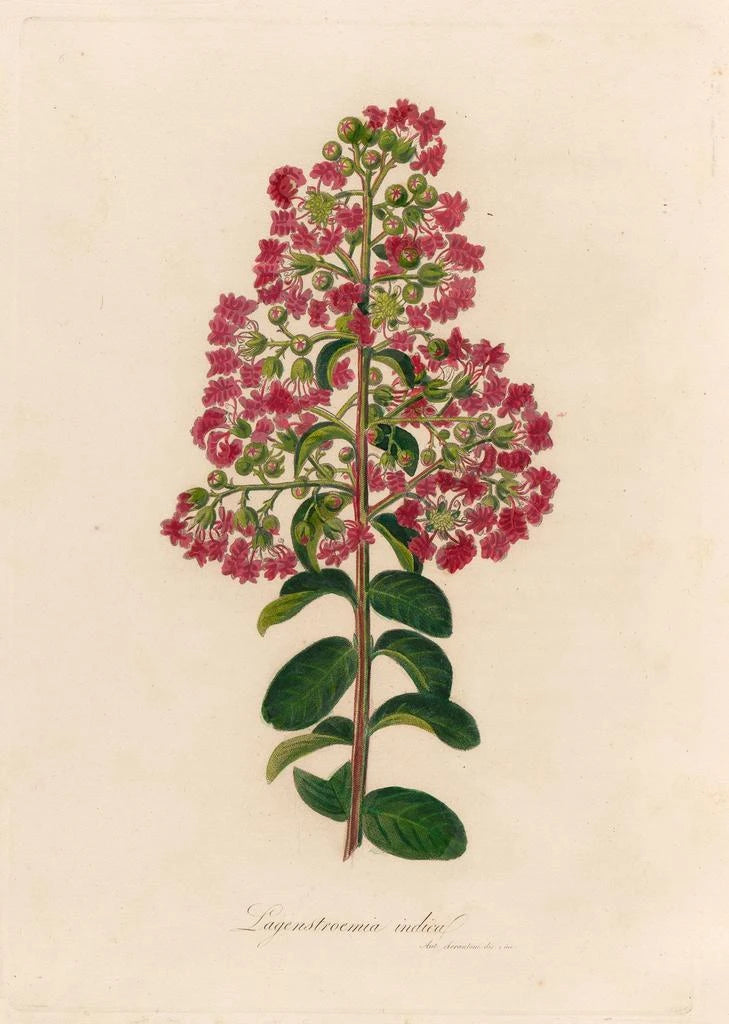 Gaetano Savi, an emblematic figure of the 18th century, skillfully combined his botanical expertise with his artistic talent. His works, such as Lagenstroemia indica, testify to an era when art and science came together to better explore nature. Influenced by the principles of neoclassicism, Savi sought to capture the beauty of plants with remarkable precision. His legacy endures, offering a valuable insight into flora at a time when the study of plants was flourishing.