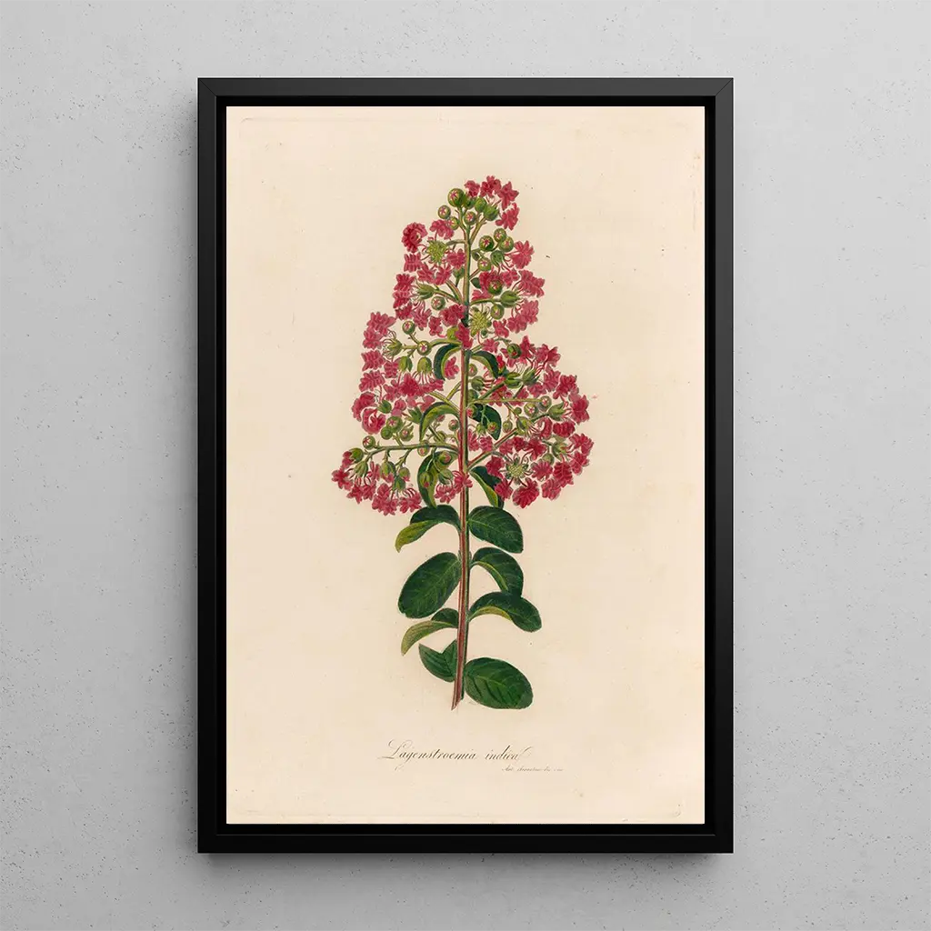 Lagenstroemia indica, often known as crepe myrtle, is an art print that celebrates the splendor of exotic flowers. With its shades of pink, purple, and white, this reproduction evokes a sense of serenity and harmony. The painting technique used highlights the delicate textures of the petals and leaves, creating an almost tangible atmosphere. Every detail is carefully rendered, allowing the viewer to immerse themselves in an enchanting floral universe.