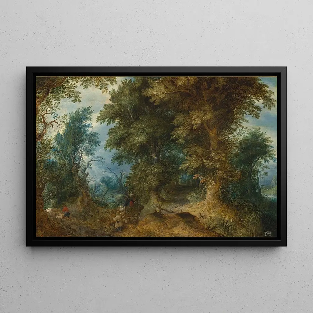 The art print "Landscape Forest Scene" by Abraham Govaerts evokes an immersion into a wooded world, where light filters through dense foliage. The rich, earthy colors, ranging from deep greens to warm browns, create a calming and serene atmosphere. Govaerts's technique, characterized by delicate brushstrokes and meticulous attention to detail, brings to life every element of the scene, from majestic trees to shimmering streams. This art print invites contemplation, offering a visual escape to a natural haven of peace.