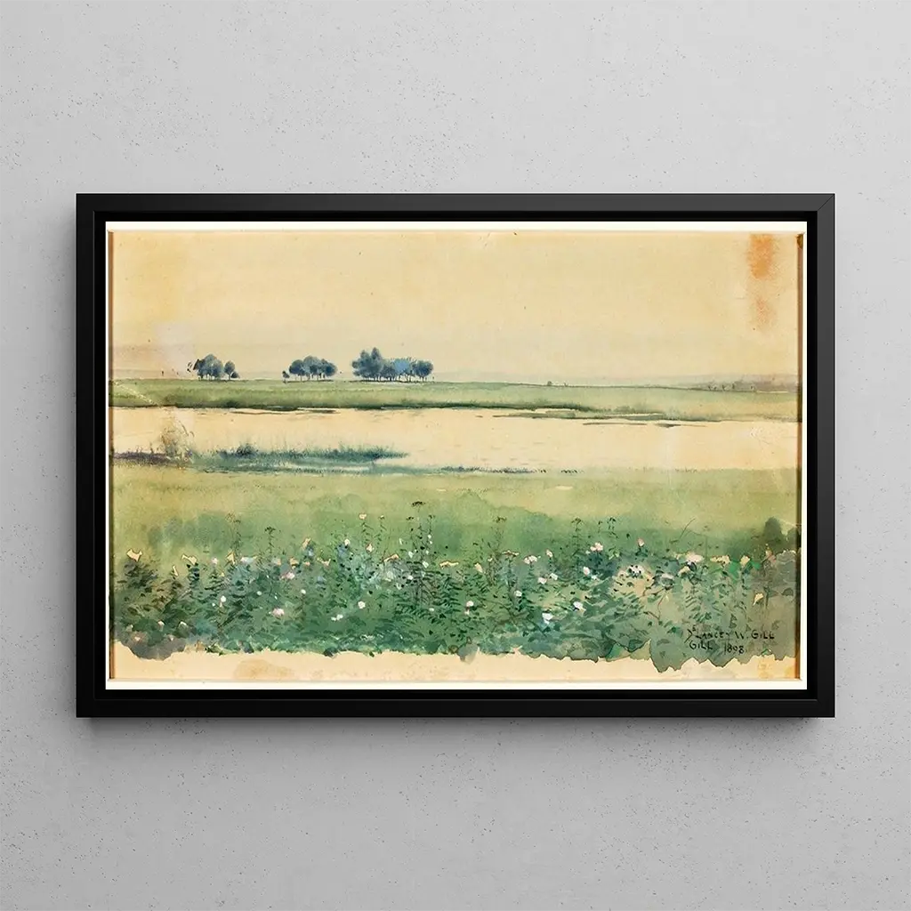 In this art print of the painting Paysage with Marsh, De Lancey Gill transports us to a peaceful universe where nature flourishes. The soft colors and shades of green blend harmoniously, creating a soothing atmosphere. Gill's technique, characterized by delicate brushstrokes, brings life to every element of the landscape, from reflections in the water to lush foliage. This art print invites contemplation, offering a moment of respite to the viewer, like an open window to an idyllic world.