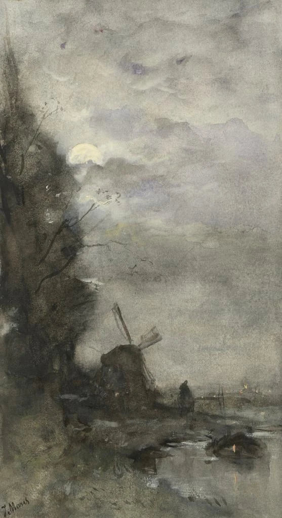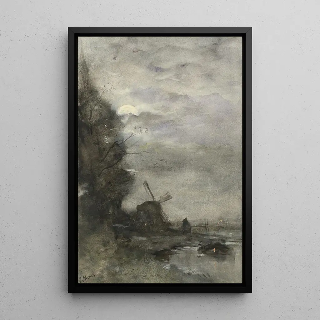 The art print "Landscape with Mill under Moonlight" by Jacob Maris immerses us in a nighttime scene filled with tranquility. The painting depicts a majestic mill standing against a starry sky, bathed in a soft, silvery light. The dark hues of the landscape contrast with the luminous reflections on the water, creating a peaceful and contemplative atmosphere. Maris's technique, which skillfully blends realism with an impressionist touch, allows you to feel the magic of a quiet night, where every detail seems to come alive under the moon's glow.
