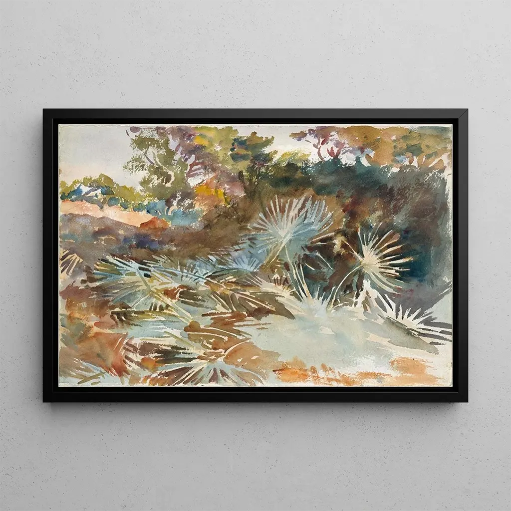 In "Landscape with Palms," John Singer Sargent transports us to a world of serenity and natural beauty. This art print evokes lush landscapes, where palms stand majestically under a azure sky. The shades of green and blue, combined with soft lighting, create a peaceful and dreamy atmosphere. Sargent, master of light and textures, manages to capture the delicacy of the foliage and the warmth of the sun, offering a true invitation to escape.