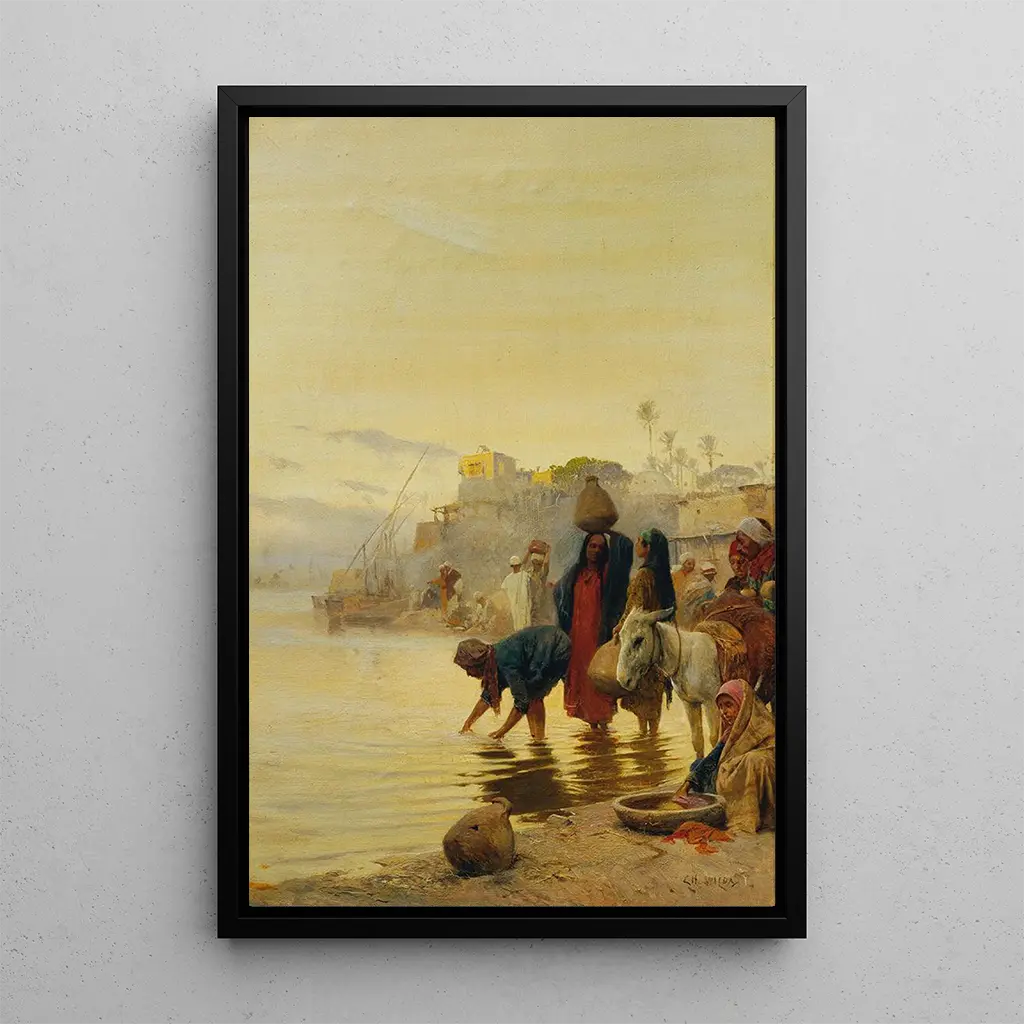 In "Lavandières sur le Nil," Charles Wilda immerses us in a peaceful yet vibrant atmosphere, where the warm colors of the setting sun reflect on the calm waters of the river. The washerwomen, central figures of this art print, are busy with their daily tasks, creating a lively tableau of humanity and nature. Wilda's technique, blending meticulous details with impressionist touches, brings each movement and splash of water to life. The piece exudes a palpable serenity, inviting viewers to contemplate this frozen moment in time, where everyday simplicity transforms into art.