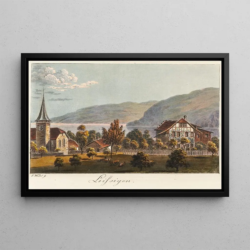The Leissigen painting by Jakob Samuel Weibel is a work that invites contemplation. With its soft hues and shades of green, it captures the tranquil beauty of an Alpine landscape. The artist's technique, blending watercolor and oil, creates a soothing atmosphere, where light plays on the water surfaces and mountain peaks. Each brushstroke seems to whisper the secrets of nature, transporting the viewer to a world of peace and harmony. This art print not only evokes the splendor of the Swiss Alps but also a sense of nostalgia for simple and serene moments.
