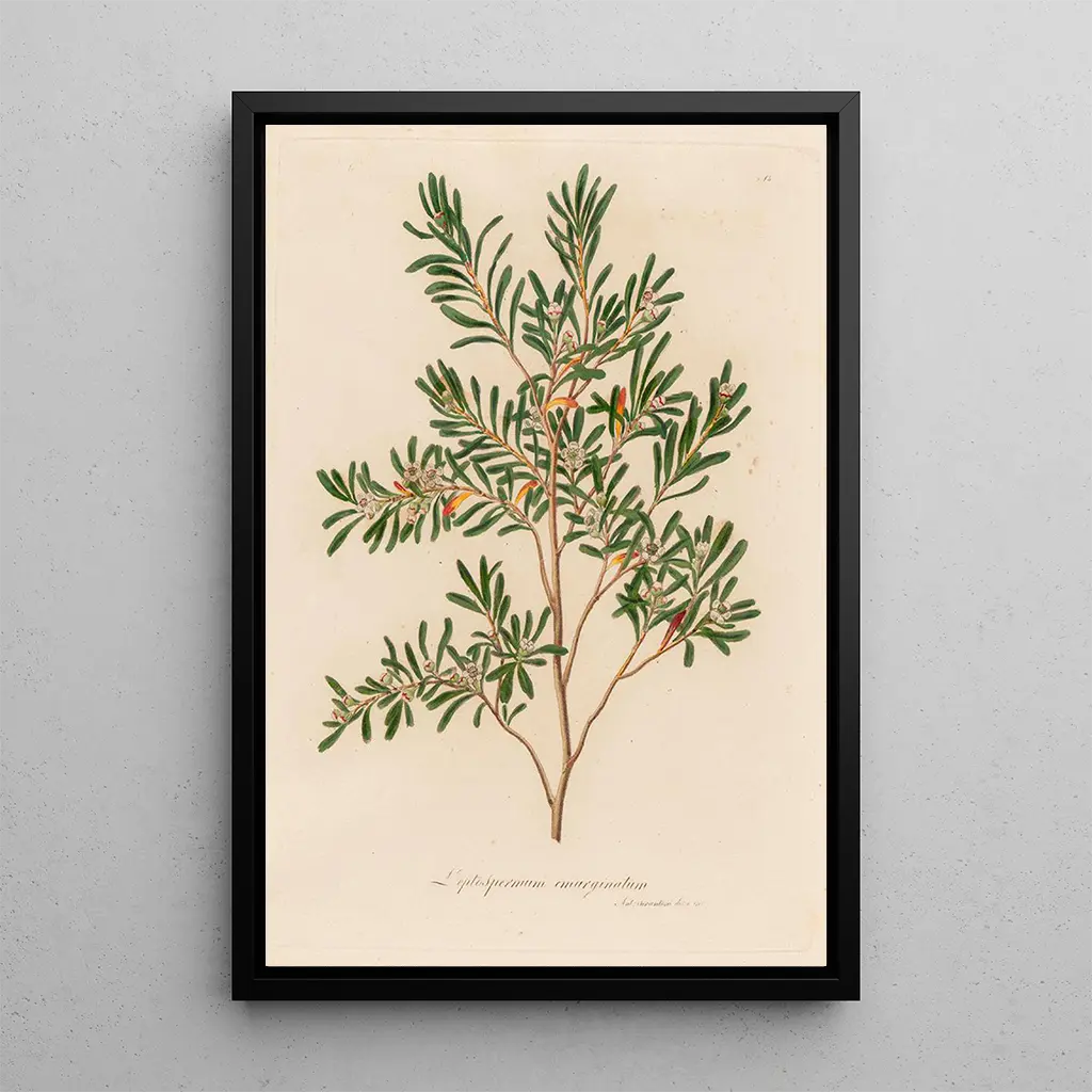 The art print of Leptospermum emarginatum transports us to the heart of a natural landscape, where Australian flora expresses itself with strength and delicacy. The soft shades of green and white, combined with touches of pink, evoke the freshness of spring mornings. The painting technique used highlights the texture of the leaves and the finesse of the flowers, creating a serene and contemplative atmosphere. Every brushstroke seems to capture the breath of nature, inviting the viewer to appreciate the simplicity and beauty of this iconic plant.