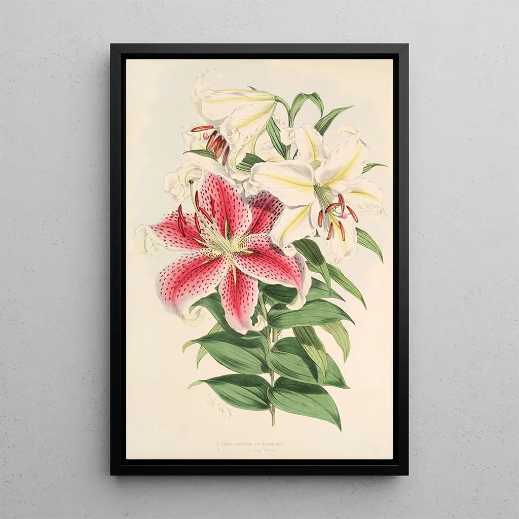 Lilium auratum var Parkmanm : a delicate celebration of nature Lilium auratum var Parkmanm, an art print by Walter Hood Fitch, is a captivating representation of floral beauty. This botanical illustration, created with remarkable precision, highlights the delicate petals and vibrant nuances of this lily variety. The vivid colors, ranging from golden yellow to deep red, create a warm and inviting atmosphere. Fitch's technique, combining watercolor and drawing, captures the intricate details of the flower, from the veining of the petals to the lush leaves surrounding it. This art print invites attentive contemplation, revealing the complexity and harmony of nature. Walter Hood Fitch: a pioneer of botanical illustration Walter Hood Fitch is recognized as one of the greatest botanical illustrators of the 19th century. Born in 1817, he dedicated his life to the study and depiction of plants, influenced by scientific advances of his time and a passion for botany. Fitch collaborated with many renowned botanists, contributing to prestigious publications such as "The Botanical Magazine." His unique style, characterized by meticulous attention to detail and a vibrant color palette, paid homage to the beauty of plants while serving as an educational tool. Lilium auratum var Parkmanm is a perfect example of his talent and commitment to science and art. A decorative art print with multiple virtues The art print of Lilium auratum var Parkmanm is an ideal choice to enhance various living spaces, whether in a living room, office, or bedroom. Its printing quality guarantees faithful reproduction of the colors and details of the original work, adding a touch of elegance and sophistication to your interior decor. This artwork, with its undeniable aesthetic appeal, can serve as a focal point in a room or as a complementary element to other art prints. By integrating this canvas into your decor, you invite the beauty of nature into your home while celebrating the artistic legacy of Walter Hood Fitch.
