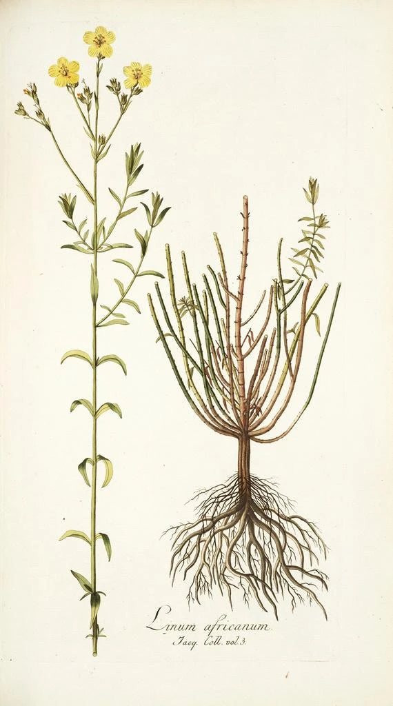 Nikolaus Joseph Freiherr von Jacquin, a botanist and illustrator of the 18th century, left a significant mark on the history of botanical art through his notable contributions. His travels around the world, especially in Africa, allowed him to discover and document a multitude of plants. His approach combines science and art, making his works not only informative but also aesthetically pleasing. Linum africanum is a perfect example of his talent, illustrating the richness of biodiversity and the importance of preserving plant species. His work remains a reference for botanical and art enthusiasts.