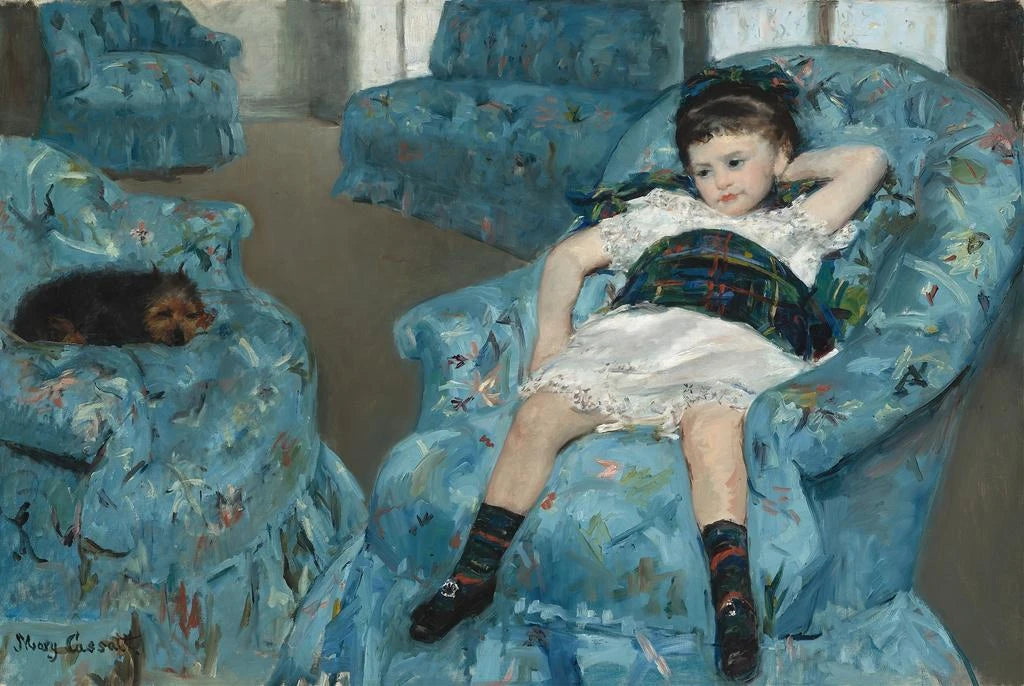 In this delicate artwork, Mary Cassatt captures the innocence and serenity of a young girl sitting in a blue armchair. The pastel colors, dominated by shades of blue and pink, create a soft and soothing atmosphere. The gentle light bathing the scene highlights the delicate features of the child, while the richly decorated armchair adds a touch of sophistication to this intimate composition. The oil painting technique allows Cassatt to play with textures, making the fabric of the armchair almost tangible and the child's skin irresistibly soft.