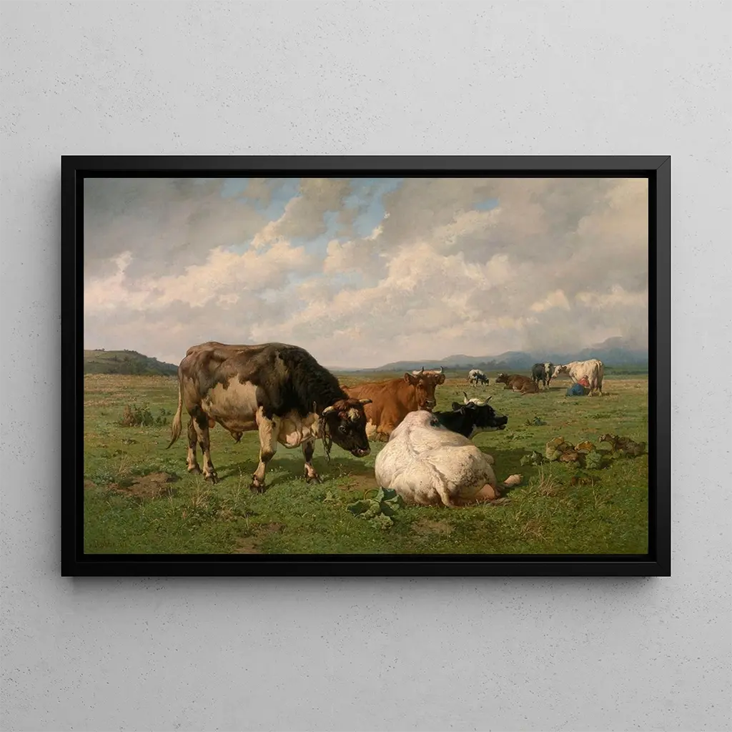 Dans cette art print de Bétail dans le pré, Louis Robbe nous transporte au cœur d'un paysage pastoral où la nature s'épanouit. Les teintes douces et lumineuses évoquent la lumière du jour, tandis que les animaux paisibles se mêlent harmonieusement à la verdure environnante. La technique de Robbe, qui allie réalisme et impressionnisme, crée une atmosphère apaisante, presque méditative. Chaque détail, des reflets dans l'eau aux ombres des arbres, contribue à une composition équilibrée qui invite à la contemplation et à l'évasion.