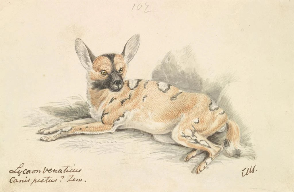 Lycaon, an iconic work by Charles Hamilton Smith, captures the very essence of wildlife. This painting, rich in detail, features a majestic wolf, symbol of untamed nature. The earthy colors, blended with shades of gray and brown, create an atmosphere that is both realistic and poetic. The artist's technique, which combines realism with a romantic touch, allows the viewer to feel the power and grace of this animal. Light plays a crucial role, highlighting the features of the Lycaon and giving it an almost mythical presence in its natural habitat.