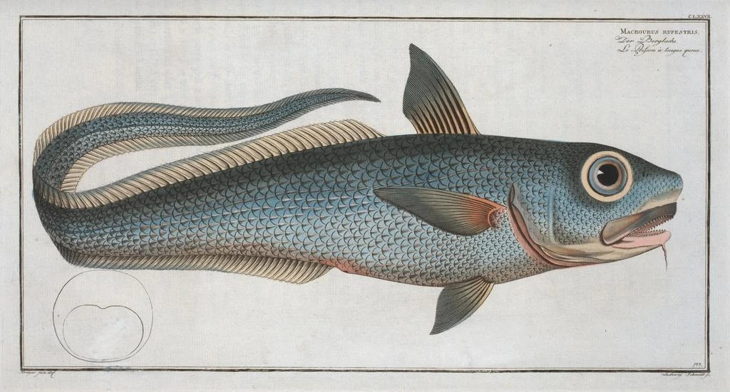 Macrourus rupestris: a dive into the marine depths The art print of Macrourus rupestris, created by Marcus Elieser Bloch, transports us into a fascinating aquatic universe. This piece highlights the intricate details of this deep-sea fish, with colors ranging from deep blue to silvery gray, evoking the filtered light underwater. The aquatint engraving technique captures the texture of the fish's skin in an almost tangible way, creating an atmosphere that is both mysterious and captivating. The work invites attentive contemplation, revealing the hidden beauty of marine creatures. Marcus Elieser Bloch: a pioneer of artistic ichthyology Marcus Elieser Bloch, a naturalist and artist of the 18th century, is renowned for his contributions to ichthyology, the study of fish. Born in 1723 in Germany, he traveled across Europe to collect specimens and depict them with remarkable accuracy. His major work, "Ichthyology," was published in several volumes and influenced many scientists and artists. Bloch successfully combined art and science, paying homage to the diversity of marine species while placing them within an artistic context of his time, when curiosity about nature was flourishing. A decorative acquisition with multiple advantages The art print of Macrourus rupestris is an ideal decorative piece to add a marine touch to your interior. Whether in a living room, office, or bedroom, this piece catches the eye and sparks conversations. Its printing quality ensures fidelity to the original details, while its aesthetic appeal enriches the ambiance of any space. By incorporating this canvas, you offer not only a work of art but also a tribute to the beauty of the marine depths, transforming your decor into a true ode to nature.
