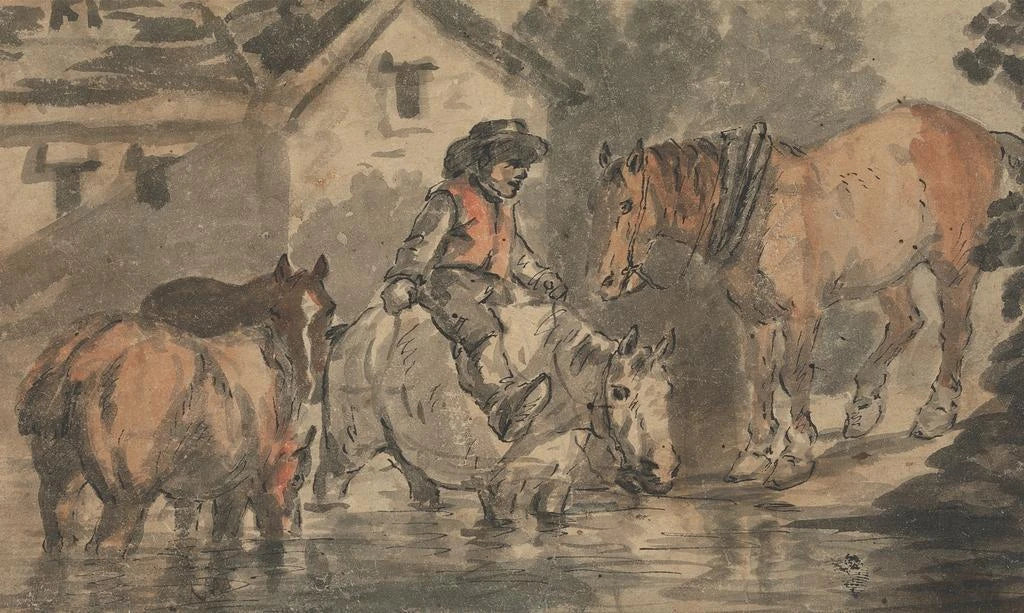 Man watering four horses: a bucolic scene full of life